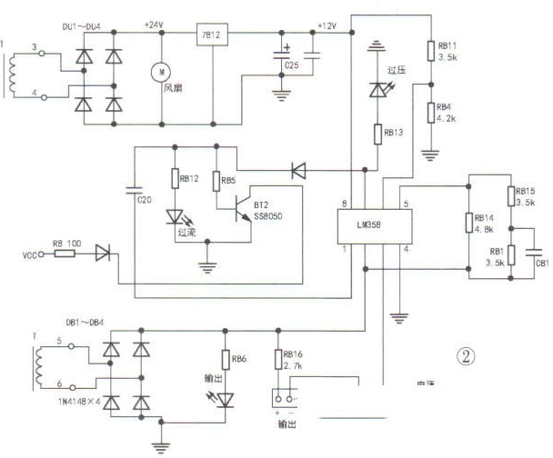 | 油烟净化器主要用于饭店、餐厅、学校食堂等场所,对厨房排放的油烟进行净化处理,其工作原理如下:220V交流电经整流滤波后得到300V直流电,供给逆变电路,输出高压,加到空气流通网上,烧化油烟,从而达到净化空气的目的。由于该设备工作于潮湿的环境中,高压电路易损坏,加之图纸资料匮乏、芯片型号被抹去等原因造成维修困难。为此,笔者实绘出该类机器电路,其高压产生电路如图1所示。 IR2153系美国IR公司生产,是一种双通道、栅极驱动、高压高速功率器件的驱动芯片。主要用于电机调速、电源变换等功率驱动。IR2153①脚(VCC)得电后(电压约为15.6V),⑥、⑦脚输出驱动脉冲,控制Q1、Q2交替导通。当Q1导通时,电流通路: +300V->Q1->T的②-①绕组->C22->GND;当Q2导通时,电流通路:C22->T的①-②绕组->Q2->GND。高压变压器T的③-④绕组的感应电压经DU1~DU4整流后,输出24V,-路供给风扇,另路通过7812稳压后输出12V,供给运算放大器LM358 ,如图2所示。 T的⑤-⑥绕组的感应电压经DB1~DB4整流后,其脉冲作为LM358的基准电压。 如果电路过压或过流,LM358①脚输出高电平,BT2(SS8050 )导通,IR2153①脚工作电压VCC被大幅拉低,IR2153停止工作。 故障表现为1:上电后所有指示灯不亮,高压无输出,风扇不转。 故障原因分析:首先测量IR2153①脚电压,如果电压正常(约15.6V),则更换IR2153;如果电压太低,先检查RD3、D23、C24(见图1)及BT2.LM358等元件(见图2),然后代换IR2153。 另外,如果IR2153①脚电压太低,也可先拆下IR2153,,上电后测IR2153①脚焊盘处电压,若电压正常,则可判断IR2153内部损坏。 故障表现为2:上电后电源指示灯闪烁,电压间歇性输出。 故障原因分析:此故障系IR2153①脚电压不稳定所致,其原因为稳压二极管D23性能不良,换新即可。 故障表现为3:高压输出正常,但电风扇不转。 故障原因分析:测量7812的输入端电压,若24V电压异常,则更换电风扇。 故障表现为4:间歇性输出,并且过流和过压指示灯全亮。 故障原因分析:首先更换LM358,如果故障依旧,则代换BT2(SS8050),如果没有贴片式的三极管,可换用直插式三极管S8050。 |