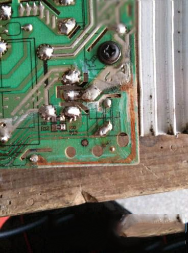 | 最近收到同行送来的故障机壹台康佳电磁炉,故障表现为为通电开机大约三秒就自动跳到开关灯一直闪烁,重启依旧,无检锅声,按照平常思路一般无检锅声虽然不检锅但不会自动跳到开关灯闪烁,由于基础没打好,期间查书籍看到浪涌电路有故障会导致不加热功效管不导通,然后就逐个查,没查出个结果,后面才注意到下图中地方绝缘漆全起泡了,全部刮开铜片里面的铜像铁锈一样一刮就掉了碎了,拿万用表一量不通断路了,找条线接上试机正常,故障修复。 |