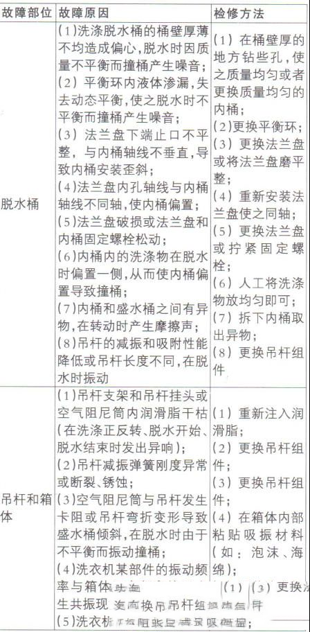 | 全自动波轮洗衣机振动和噪音主要是传动系统、机械支撑等系统异常所致,具体原因与检修思路如表1所示。除此之外,安放位置不当也是常见原因。因此,实修时首先检查洗衣机安放是否平稳。 提示:全自动波轮洗衣机在整个工作程序中都会产生振动和噪音,尤其在脱水过程中振动和噪音相对较大,即使是超静音和变频全自动洗衣机,家用电动洗衣机国家标准规定:最大噪音应不大于72dB(A);洗衣机前后左右各侧面中央部位的振幅:额定容量在5kg及以下,振幅<0.8mm;额定容量在5kg以上,振幅≤1.0mm。盖板中央部位的振幅:额定容量在5kg及以下,振幅≤1.0mm;额定容量在5kg以上,振幅≤1.2mm。下图为全自动波轮洗衣机振动和噪音故障原因和检修思路对照表。 |