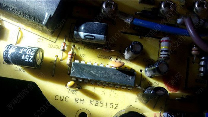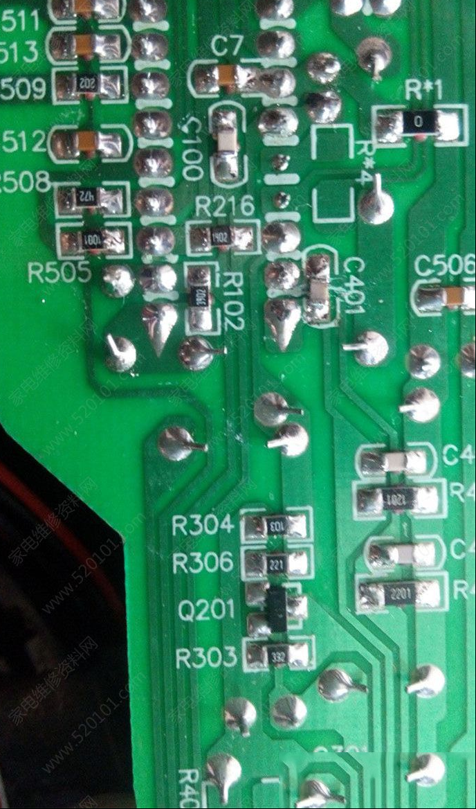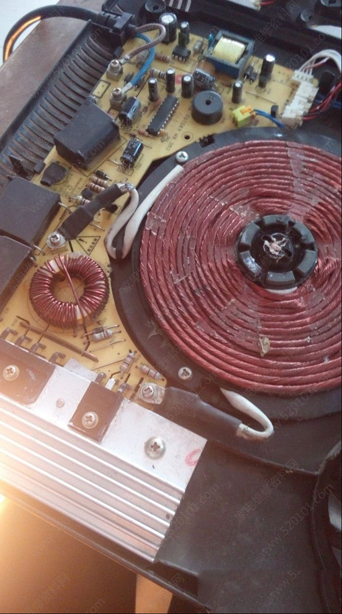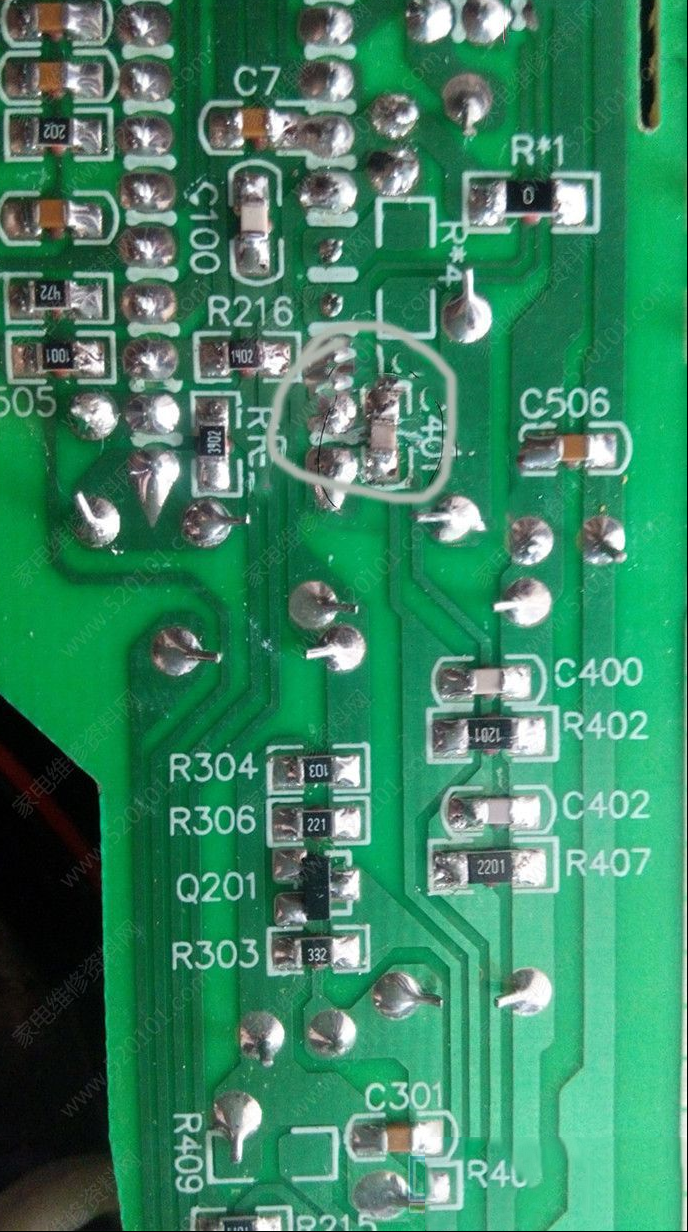 | 收到同行送来的故障机壹台九阳C21-SC008电磁炉,客户反映断续加热,试机故障和用户描述一致,打开检查没有功率可调电阻,在检查大电阻阻值正常,大电容阻值正常,没有发现其他明显问题,合盖再次试机发现把锅抬高点可以持续加热,于是开盖检查同步电路,大电阻没有阻值变大也没有热稳定性不良的,又延同步电路继续向下查,R402的1.2K电阻和R407的2.2K电阻也没有问题,下一步就到九阳专用芯片(JYM01020ED)了,看到两角之间有一个贴片电容C401,怀疑是不是漏电,拆下测量容量0.301nF,先不管直接找一个代换,随便找一个换上(221的最后实测303是个漏电的),试机不检锅,更怀疑是电容问题,于是拆下换上的电容再试机,可以正常加热,于是查电路该电容容量为301,原电容没有问题,于是把原来的粘胶清理干净,焊上原电容,试机一切正常,交付给用户使用。 附:九阳JYC-21GS02电磁炉电路原理图 |