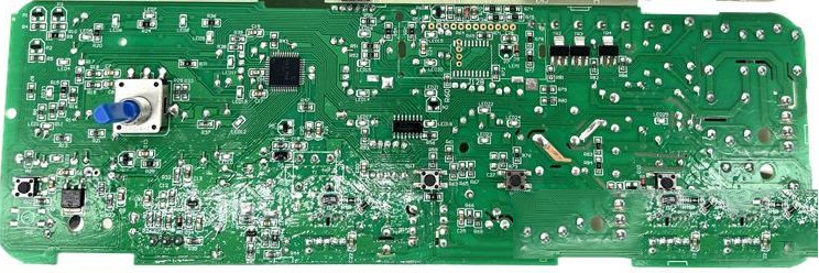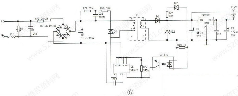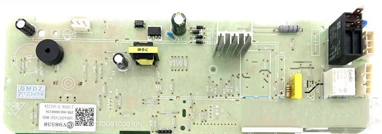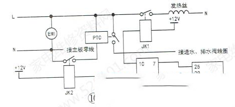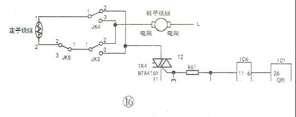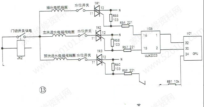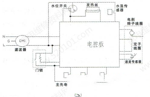 | 本文以海尔XQG50-807型滚筒洗衣机为例,介绍该系列洗衣机电控板的维修实例,供同行参考。该洗衣机外观与电控板安装位置如图1、图2所示,电控板外形如图3、图4所示。 一、电源供电部分原理与常见故障检修 1.工作原理 开关电源电路原理图,如图6所示。AC220V电源经过电路板“细线”替代的保险丝FU1后并接了压敏电阻,用于防止瞬间的高电压进入板子,损坏、烧毁器件,之后火线串接了2W的限流电阻,连接到由四颗二极管组成的整流桥,整流输出的直流电经E1电解电容滤波后经开关变压器的①、③脚后直接加到TNY276开关管模块IC8的④脚,期间由R74、R75、D4等组成尖峰脉冲吸收电路,防止开关管“通/断”期间反峰电压击穿管子。当开关电源工作时,从开关变压器次级⑧脚输出经D6二极管整流滤波后的直流电并接了稳压管DZ2,确保输出电压的稳定,同时还串接了稳压取样电路中的DZ1稳压管,如果输出电压偏高,IC9(817 )光耦初级电流变大,发光变强,次级导通变强,用于调整、减弱TNY276模块内的开关管的导通频率,从而间接控制、降低与稳定输出电压。输出+12V的电压供继电器等使用以及经过7805三端稳压块后输出+5V电压供CPU等使用。输出电压偏低的分析方法雷同,本处不再累赘! 2.常见故障检修 例1:收到其他维修同行的一台xQG50-807滚筒洗衣机,上电后指示灯不亮,整机无反应。 故障原因分析:测量用户家的AC220V正常,打开洗衣机顶盖,没有发现线路破损的现象。测量滤波器,如图7所示,输入与输出电压均有AC220V,初步估计问题应该在电控板。 卸下电控板,通入AC220V电压,使用万用表测量全波整流输出有DC311V,但是测量开关变压器次级D6二极管阴极电压为0V,估计次级负载短路所致。断电后,测量次级D6输出直流电阻为02,故障范围肯定在D6或之后的电路器件,当万用表检测到12V稳压管DZ2时,发现该管子如图8所示,已击穿损坏,导致次级输出短路。更换新的12V稳压管IN4742后,故障修复,通电指示灯工作,上电瞬间蜂鸣器工作,机子恢复正常。 例2:收到其他维修同行的一台xQG50-807滚筒洗衣机,上电后指示灯不亮,整机无反应。 故障原因分析:上门维修,检查市电正常,洗衣机线路无损,估计电控板损坏所致。測量开关电源次级输出端无+12V、+5V电压,测量开关电源初级输入端有AC220V,整流滤波后有DC314V,初步估计开关电源不起振导致。测量TNY276模块的④脚与热地(⑤~⑧脚)有147k正常,测量光耦输入与输出级正常,当检测到稳压管DZ1时,发现已经双向击穿导通损坏,导致光耦器输入端无供电,输出端不工作,致使开关管模块IC8不起振,所以没电压输出。更换新的DZ1,11V稳压管(型号:IN5241B)后,如图9所示,故障修复。 例3:收到其他维修同行的一台xQG50-807滚筒洗衣机,上电后指示灯会亮,但各功能失常。 故障原因分析:上门检查,上电后发现该洗衣机指示灯会亮,但是各功能失常。测量市电有AC220V,整流桥输出有DC310V正常,当检测开关电源次级D6输出仅有DC4.3V,说明次级输出电源异常,断电后对开关电源的稳压、模块等测量均正常,此时发现次级的滤波电解电容E2有鼓涨现象,烙铁卸下后使用万用表电容档测量其容量为0uF/25V,问题已查出,就是此电解电容无容量导致D6整流后电压值低的现象,同时还听到开关变压器“吱吱”的声音,说明开关变压器已经严重超负荷。更换680uF/25V以.上容量和耐压的电解电容后故障机修到这里,终于修好值得探讨。,开关电源“吱吱"声音也消失了,恢复正常。 二、延时门锁与发热丝控制电路原理与常见检修思路 1.电路原理 延时门锁与发热丝控制电路原理图,如图10所示。 当机子上电时,LN经电源滤波器EMI后,火线并接门锁PTC、触点的一端后直接加到发热丝继电器开关JK1的一端;零线端一路接主板的开关电源,另一路接到继电器JK2触点的一端。当按压电源键主板得电工作时,指示灯点亮,CPU的四脚送出高电平到IC6, ULN2003反相器的③脚,从④脚输出低电平,使JK2继电器线圈两端有12V的电压继电 器工作,触头闭合,门锁内部的PTC有AC220V电压,双金属片发热变形延时1-3分钟后,门锁开关6A触头闭合,送电到进水、排水线圈一端。 当需要温水洗涤时,CPU的写脚输出高电平送到ULN2003的⑦脚,从①脚输出低电平,从而使JK1继电器线圈两端有12V 的电压,继电器工作,17A触头闭合,送电到发热丝对水温加热。 2.常见故障检修 例1:收到其他维修同行的一台xQG50-807滚筒洗衣机,上电后指示灯会亮,蜂鸣器发出“滴、滴”的报警声音。 故障原因分析:上门检查,按电源键,面板指示灯会亮,同时蜂鸣器发出“滴、滴"的报警声音,洗衣机洗涤、脱水功能都不能启动。检查开关电源+12V、+5V输出的电压正常,测量门锁,如图11所示的1、3端有AC220V,但是门锁触头就是不闭合导致进水、排水阀不供电而发出“滴、滴"的报警声音。撬开门锁后发现内部的PTC (热敏电阻)已经碎裂损坏,如图12所示,更换新的门锁后故障机修到这里,终于修好值得探讨。。 例2:收到其他维修同行的一台XQG50 -807滚筒洗衣机,不能进行温水洗涤。 故障原因分析:上门检查,调整程序选择旋钮至任意一个温水洗涤的功能时,都不能对水进行加热,实现温水洗涤。以为发热丝烧毁,断电后测量发热丝阻值30Ω,正常。再次调至温水洗涤功能,进水阀进水完毕,测量发热丝两端接线柱没有AC220V电压,顺着线路找到继电器JK1,其线圈两端有12V电压,说明是继电器触头不闭合,导致此故障。 近几年陆续