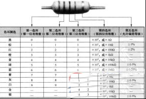 | 有关电阻标称值五环电阻色环的表示方法,五环电阻标注示意图,五环电阻中色环的具体含义解读示意图,以及电阻标称值五环电阻色环的识别方法,供大家参考。电阻标称值五环电阻色环标示方法 之前介绍了电阻标称值四环电阻色环的标示方法,这节来看看电阻标称值五环电阻色环的标示方法。 图一是五环电阻标注示意图。 推荐:色环电阻的识别方法 从5条色环的电阻示意图中可以看出,第一、二、三条分别表示3位有效数(精密电阻用3位有效数表示),第四条为倍乘色环(或有效数有几个0的色环),第五条为允许偏差等级色环。 图一 五环电阻标注示意图 从上图所示示意图中可以看出,第四环和第五环之间的距离比较远,这样可以确定哪一环是第一色环,哪环是第五色环。 五环电阻多为精密电阻。色标法中用色环的颜色表示0~9。 图二是五环电阻中色环的具体含义解读示意图。 图二 五环电阻中色环的具体含义解读示意图 电阻标称值五环电阻色环的识别方法: 1)、色标法中用色环的颜色来表示某个特定的数字或倍乘数、允许偏差等级,整个色环的颜色共有12种和一个本色(电阻本身颜色)。 2)、标称阻值单位为Ω。 3)、当允许偏差等你为±20%时,表示允许偏差的这条色环为电阻本色,此时4条色环电阻只有3条。 |