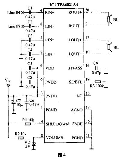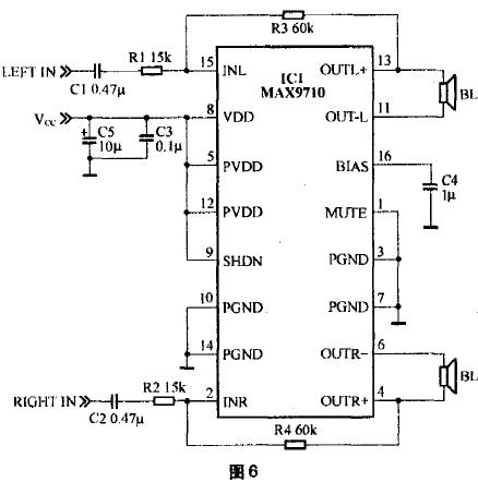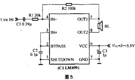 | TDA2822M是意法半导体(ST)早期专门为便携式录放音设备开发的双声道音频功放集成电路,具有低交越失真和低静态电流的特点,可工作于双声道立体声或单声道桥式放大(BTL)模式。TDA2822M工作电压范围很宽,在1.8V-15V范围内均可正常工作。 TDA2822M是一片非常经典的优秀音频功率放大集成电路,20世纪90年代初曾经被国内外家电厂商广泛用于便携式收录机中,在一些功率稍大的,尤其是带有机身扬声器的随身听中也可以经常看到TDA2822M的身影。 TDA2822M的标称输出功率(1KHz,8Ω,9V,10%总失真)立体声方式时可以达到1W,桥接方式时可以达到2W。 TDA2822M的其他技术指标如下: 最大峰值电流(PeakOutputCurrent):1A; 静态电流(QuiescentDrainCurrent):≤9mAVcc=3V); 总谐波失真(1kHz,8Ω~32Ω,典型值):0.2%; 闭环增益(典型值):39dB; 声道不平衡度(立体声状态,最大值):±1dB! 声道分离度(1kHz,立体声状态,典型值):50dB; 输入阻抗(1kHz,最小值):100kΩ; 负载范围:≥4Ω。 TDA2822M价格便宜,不过购买时最好是买TDA开头的,最好是意法半导体原装的,不要买D开头的,也不要买TDA2822(即结尾没有“M”的)。前者音质不好,后者供电电压范围窄,有DIP16封装的,比较少见,音质未见评论。 实际制作中多采用桥接方式,可以省去两个容易影响音质的输出电容,图1是一个声道的电路图,实际制作中需要两套这样的电路。TDA2822M可以采用直耦方式工作,前提是输入信号不能带直流成分,否则在音源输入端应加上耦合电容。 在第一次上电时先不要接扬声器,用万用表测一下输出端(1脚与3脚之间),如果在毫伏级别就可以放心使用了,否则最好在输入端(7脚)接入一个1uF的高品质电容,如CBB电容,当然,电解电容也可以。测量的时候注意万用表的挡位应该由大向小调,不要一下子放在最低挡以免烧坏仪表。 图1所示的放大器是针对MP3播放器的,所以7脚的输入电阻选用了820Ω,而不是典型的10kΩ,因为MP3播放器的输出负载一般是32Ω的耳机,虽然采用为32Ω的电阻可能比较好,不过这样MP3播放器就会比较费电,而且这个功放就很难使用其他音源了。 实际制作时可以直接采用实验板,有条件的采用印制电路板更好。采用自制印制电路板时由于元器件比较少,可以不用钻孔,将元器件直接焊接在铜箔面,即所谓的“壅根焊”。阻容元件将引脚适当剪短,TDA2822M沿下沿剪齐,平放好焊接即可。 如果有条件,图1中5脚的电容C2最好采用CBB电容,可以改善音质。实际试听中可以试着把1、3脚的电阻R2、R3和电容C4、C5去掉,如果听感没有区别,功放也不自激,也是可以的。直观的判断方法是:自激时,IC【温度wd】相比之下有很大提高。 由于TDA2822M的供电范围很宽,音质很好,这个放大器完全可以用于电脑多媒体功放,听感上不亚于一两百元的产品。 整个电路采用单独的变压器供电,6V~9V的都可以用。滤波和稳压可以采用常见的有源滤波电路或者采用三端稳压器,以提高信噪比,这里推荐一种比较有特色的,如图2所示。该电路与我们通常见到的电子滤波电路不同的地方主要是在三极管的基极加入了电感线圈,从而达到用小功率、小感量的电感来达到理想的滤波效果。该电路可以很好地滤除工频dianyuan电源中的交流声。 图2中的VT1也可以采用2SC3074、2SD14092SD882等2A以上的中功率管。VT1、VT2基极的电容C2、C3采用近似容量的CBB电容,效果会更好。电感L1可以自制,用Φ0.15mm左右的漆包线在100kΩ的电阻上乱绕200匝即可,也可以用收音机上中周的一个绕组代替,也可以采用330uH以上的色码电感。二.其他几种集成功放 如果你觉得TDA2822M太老了,不够新潮,也可以采用各公司新推出的针对平板显示设备(平板显示器、平板电视机等)和笔记本电脑的音频集成电路来打造有源音箱。 这些器件多采用4.5V~5.5V供电,用集成的桥接方式(BTL)向低至3Ω的负载提供1W以上的功率,有的还集成耳机放大器,针对近声场模式,大多具有很高的dianyuan电源纹波抑制能力和共模噪声抑制能力,有的还具备比较高的射频噪声抑制能力,以避免听音乐时如果有手机来电会昕到烦人的“喀嚓声”。这里笔者举几个做过简单实验的例子,供参考。1、TPA6021A4 这是TI(德州仪器)针对笔记本电脑、平板监视器推出的桥接方式的立体声音频放大器,集成独立的耳机放大器和32级直流音量控制器,4.5V~5.5V的供电,可以向4Ω负载提供2W的功率,DIP封装适合于用实验板安装。TPA6021A4支持的是平衡/不平衡输入,这里使用的不平衡输入方式,音量控制略去不用,固定为约10dB的增益,待机功能也关闭不用,耳机方式也去掉未用。 TPA6021A4和TPA2008D2、TPA6011A4、TPA6030A4是同系列的产品.不过TPA6021A4是双列直插封装,更便于试验条件下的安装。图4是典型应用图。 TPA6021A4集成了输入电阻,同样可以和C1(C2)组成高通滤波器,计算公式为2.2/C1,C1的单位用uF,计算出来的截止频率的单位是Hz,图4中,约为5Hz。 如果在使用中TPA6021A4发烫,应考虑在其上加一个小的散热片,如果使用印制电路板可以设计大面积的地并镀锡来解决散热问题。2、LM4991 这是国半(NationalSemiconductor)针对笔记本电脑、平板监视器、PDA推出的桥接方式的单通道音频放大器,具备待机模式,只消耗0.1uA(典型值)待机电流,2.2V~5.5V供电,可以向3Ω负载提供3W的功率,SOP(扁平)封装,组建立体声系统需要两块集成电路。图5是其典型应用图。 图5中,R1和R2决定了放大器的增益,一般通过调整R2来调整增益,计算公式为:2×(R2/R1),单位是dB。C1和R1