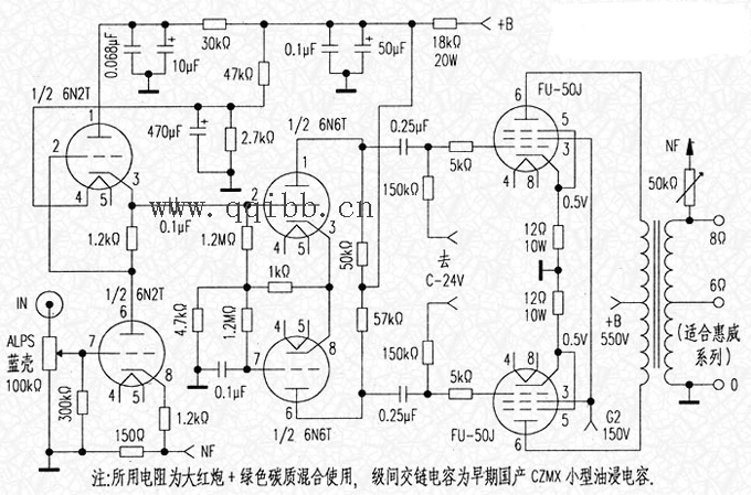 | 胆机热自上世纪九十年代开始不断升温.其自然淳厚.超凡脱俗的音色成为音响家族中一个不老的神话。 胆机制作选管很重要,一些天价名胆让人望而却步,我们身处电子管生产大国,在众多的胆管中不乏一些性价比极高的靓胆,Fu-50便是其中的佼佼者。此管为旁热式束射五极管,以前主要应用在通讯设备中作高频振荡或射频功率放大,有小300之称。用此管装配的推挽机音乐昧要好于6P3P、KT88等管,输出功率很容易做到50W以上。其高频细腻传神,低频生猛刚健,对付一般落地三分频倒相式音箱也能从容不迫。 本机电压放大由6N2T组成经典的SRPP单端并联推挽电路,SRPP电路的动态范围大,音质趋向于音响型,用在推挽功放电路中比较合适。由于此电路上管的阴极电位较高,故需从高压端引入一正电压接入灯丝端以提高灯丝电位防止损管。当然如用6N11、ECC88管则可不考虑这个问题,且声音会有更佳表现。 推挽兼倒相由低u管6N6T构成阴极裂相电路,此管内阻较低,推动力胜过热门专用管6N8P.本人制作的推挽功放中,倒相方式只有两种,一种是较常用的长尾倒相,另一种则为共阴极倒相电路。在业余制作没有专用仪器的情况下,要想把倒相级输出的正负半周幅值调至比较完美是极不容易的,共阴极裂相电路却能比较容易获得一对幅值极为接近的正负信号。本级承上启下,至关重要。后期调校需反复细致方可使功放工作在低失真、高效率状态。 功放级:FU-50的栅负压为固定供给式,负压板全部元件装在一块10cm×10cm的万能板上,负压调节电位器一定要使用高品质的产品,若W发生开路等不良状况必将导致功放管屏流骤增而烧毁。本机使用了4只ALPS精密线绕电位器,以确保机器的安全。在这次DIY中,输出变压器为邮购的四川广汉“凯立”成品牛,350VA的火牛为自制品,整机造价控制在700元左右。 调试:先不插管子,通电后用数字表测量机内的主电压、帘栅压、负偏压及灯丝电压,此时机内供电可视为无负荷状态,故电压可能要高于正常值约10%~20%,属正常现象。将负偏压调至最大值85v左右,在无异常情况下关闭dianyuan电源逐次插入各电子管,主要调整倒相级与功率输出级,用CD机播放小提琴《梁祝》,以乐章最后的高潮调试倒相级输出的音乐电平,重复其中的乐曲片段。小提琴独奏时中频段的频率多在1kHz~4.5kHz,比较适合调整倒相级输出电压,以数字万用表交流100V挡测量正负信号与地之间的电压,当二者电压一致时即告一段落。功率管在确定屏压及阴极电zuzhi阻值的情况下,细调4只栅负压电位器W,使4只功放管阴极对地压降为0.5V,工作点此时为屏流特性曲线中点偏负一点的位置,即AB1类放大类型。机器在一周内至少要复调3次各点电压,以后便可投入正常使用。 连接试音:音源为日本“阿尔派”后置六碟CD机+自制6N4T+6N3J前级+FU-50推挽功放+8英寸两分频“致力”书架箱,热机半小时后开音聆听,其非凡的音色完全达到了预想的效果。 |