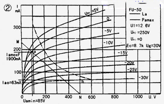 | 用FU-50制作的单瑞甲类功放,推动低灵敏度的音箱有力不从心之感,对喜欢大动态音乐的年轻人来说不太合适,为此笔者实验了两款AB类推挽功放,取得较好的效果,特奉献出来,以飨读者。 实验一线路见图1,输入级由高μ三极管6N2担任,增益约为78dB。在6N2阴极上加有整机负反馈,反馈量为—6.6dB。倒相级由6P1担任。采用三极管接法的6P1比低μ三极管(如6N8P)有更低的内阻,更大的输出电流,因而具有更大的动态范围。在低负载电阻上可输出较高的电压而失真很低,线性优良,该级增益为0.85dB。输入级与倒相级之间采用直耦电路,以保障良好的频率特性和相位特性。 输出级FU-50工:作于AB类状态。按图中数值,Po=39W,Ra=9kΩ,Ua=500V,Iao=63mA,Ug=-30V,Eg=2x30Vp-p。 现介绍设计方法: FU-50极限参数如下:Uamax=800V,Vg2max=50V,Ikmax=230mA,Pa-max=40W。取Ua=500V,用经验公式Ra=4 xUa/Ikmax=4x500V/230mA≈9kΩ,在特性曲线图(见图2)上取坐标Iamax=230mA,Ua=OV为M点,Ua=500V,Ia=0为N点,连接MN.此即为Ra=9kΩ时的动态负载线。MN线与Ug=0V的交点A, 该点电流为190mA,Uamin=85V。按AB1类放大器工作点电流为最大工作电流1/3~1/4选取原则,取Iao=1/3 Iamax=190/3=63mA。由Ia=63mA做X轴平行线与Ua=-30V曲线相交,交点即是该管工作点。此状态下,Ua=500V,Iao=63mA,Ug=-30V,Ug2=250V计算其输出功率Po=[(Uamax-Uamin)×Ia-max]÷2=[(500V-85V)×190mA]÷2=39.4W。 音频输出变压器是本机关键器件,笔者作为实验自制该变压器,效果也不错。方法如下,选用舌宽32mm优质硅钢片,叠厚40mm。初级线圈用Φ0.18mm无氧铜线共绕2×1470匝,双线并绕,分三段绕制。第一段绕2×370匝;第二段绕2×730匝;第三段绕2×370匝。将次级绕组95匝(8Ω)或68匝(4Ω)分二段夹绕在三段初级绕组之间。接线方法:把每组的三段线圈各自串联成A、B两组绕组。将A组首端与B组尾端相连,作为初级绕组的中心抽头。将A组尾端和B组首端分别接输出管屏极。两段次级绕组串联接负载。输出变压器层间用电容器纸绝缘,组间用电缆纸和黄漆绸绝缘。因线端较多,应仔细检查接法,以免弄错。铁芯三片一组交叉叠片。检查无误可浸漆处理。本机元件排列、走线、接地安排的原则与其他功放无异,此处从略。 调试:接上负载,音量电位器调至最小,调整栅压电位器置栅负压最大位置。通电预热10分钟。无打火、冒烟等异常情况后,调整W1和W2,使输出管阴极电阻上的电压为0.63V,此时每管屏流为63mA。测6N2和6P1各极电压与图中所标值应基本相符。如差别太大可调整R1的zuzhi阻值,使之达到要求。 试音:该机输出功率强劲,对大动态信号表现良好。推动低灵敏度音箱毫不费力,音乐的细节表现也相当出色。该例整机非线性失真为2%(满功率),频响20Hz~55kHz(±3dB)。 |