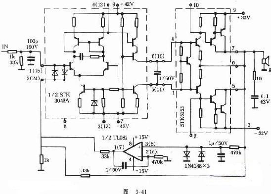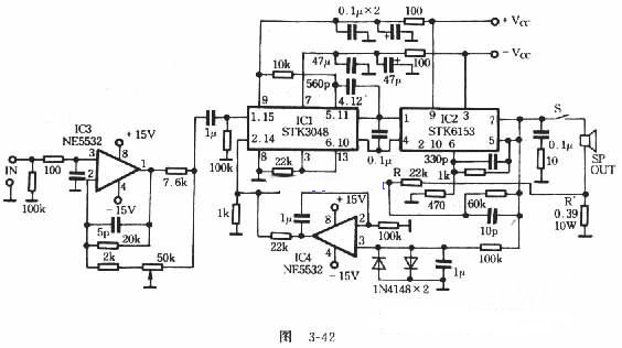 | STK3048和STK6153系日本三洋公司厚膜功放集成电路。STK3048是前级电压放大集成电路;STK6153是后级电流放大集成电路。 STK3048为15脚双声道单列式厚膜封装,其外露散热器与(8)脚相连,但与内电路绝缘。(8)脚接地后对内电路有一定屏蔽作用。该厚膜块工作时不必再另装散热器。 STK3048内部共有两级,输入级带保护的差分放大器,差分管基极的两只二极管起保护作用。其集电极的阻容串联相位补偿网络可防止输入级因突发信号产生瞬态失真。在两集电极间连接有一组镜像电流源。此电路接人的目的是将右输入管电流线性地倒相与左输入管构成两个相减的电流源,对后级实施电流激励。主电压放大级为一共基共射电路,上管对信号进行宽带放大,并为输入、输出级间的直耦提供阻抗匹配;下管线性地输出上管的放大电流旨在降低该级的开环失真,并对后级提供较大的激励功率。该两级放大管均辅以恒流源作负载,对dianyuan电源纹波抑制力较强。 STK6153为10脚单声道单列式厚膜封装(双声道需两块),内电路已与外露散热器电气绝缘。STK6153内部集成了恒压源偏置、未前级推动和未级复合电流放大电路。采用全互补对称结构,具有高速率、高精度、大功率、低噪声等优良特性。由于恒压源偏置的内置,未级大功率管始终处于最佳工作状态,具有极佳的【温度wd】补偿作用。该厚膜块的互补输出学设计成倒置式达林顿复合电路,以集电极开路的形式输出,可降低输出阻抗。 由STK3048和STK6153组成的功放电路如图3-41所示(dianyuan电源、保护电路略),虚线框内分别为前后级IC实物剖析出的内部电路。前级小电容可选用德国产WIMA或ERO优质电容,dianyuan电源滤波用大电解选用日产Marcon NIPPON、CHEMICON Nitsuko、Rubycon品牌的电容为最佳,每只大电解并联一只WIMA0.1uF~0.33uF的小电容以改善频率特性。电路不用调试即可正常工作,在总体听音感觉上,全音域范围内的各频段显得非常平衡,动态大、频响宽、失真低、瞬态响应快、音质纯净有力,且噪音特别小。电路正弦功率;2X100W、失真。 STK3048和STK6153内部电路较为简单,其音质甚佳。但外围线路的设计和外围元件的选用对IC音质影响较大,故本功放采用如图3-42所示的电路。 1.采用Gm控制音量,把音量电位器接在IC3(NE5532)的增益控制点上,改变其负反馈深度以改变音量大小。STK3048工作在最佳稳定状态。调节音量时几乎没有滑动噪音。更重要的是小音量放音时动态范围仍不变,大音量时音乐细节表现得淋漓尽致,毫无拖泥带水之感。 2.采用恒流负反馈电路,线性电阻R和R'变放大器恒压方式为恒流方式来驱动负载,使功放的瞬态特性得以改善,增强低音的力度和高音的清晰度。 3.取消环路负反馈电容,IC4(NE5532)及外围元件构成输出中点零位伺服电路。用来伺服STK3048的②、(14)脚,对取消反馈电容后而造成STK6153输出端直流电位的漂移,提高放大器的高、低频解析力。 该放大器主观听音评价:高音纤细清晰,中音明亮透彻,低音丰满强劲,音域层次分明,谐波失真小,噪音低,动态范围极宽。 由于该电路输出功率较大,应注意使用的dianyuan电源要有足够的容量,STK6153散热器不宜太小。运放IC采用独立的有源伺服dianyuan电源供电。另外,放大器务必装上扬声器保护电路。 |