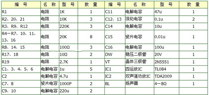 | 这里介绍一种无需调试、保真度高、成本低廉的BTL功率放大电路,并且可以根据自己的情况选取末级功放集成电路,由于通用性强,给音响爱好者制作带来极大方便。工作原理 该装置电路工作原理见图1(点此下载原理图)。这里只给出了其中一个通道的电路图,另一个通道完全相同。音频信号从电路的A端输入,经运算放大器IC1放大后(放大倍数由R1、R2决定),一路经IC2作反相放大,其增益为1;另一路经IC3、IC4作两次反相放大,增益仍然为1,其实质是IC3、IC4共同构成增益为1的正相放大器,所以在IC2的B端和IC4的C端得到的是两个大相等而相位相反的音频信号。这两个互为反相的音频信号分别通过R9、C5和R10、C6加到双音频功率放大集成电路IC5(TDA2009)的①和⑤脚端,这两个输入端是同相输入和反相输入端,因此在IC5的内部进行功率放大后,分别从IC5的⑩脚和⑧脚输出,推动扬声器BL。 元器件选择与调试 元器件清单见下表。 IC1-IC4可以用一块四运放集成电路TL084,差分放大器的频响宽、噪声低、瞬态指标高。功率集成放大器除了采用TDA2009以外,亦可选用其它同类集成电路,不作特别要求。所用电阻全部采用低噪声、精密型金属膜电阻器,其目的是降低前置级噪声,同时应使得B、C两点的信号幅度相等,所用的前置级耦合电容器也应采用精密型钽电容。三极管VT的功率应视电路所需电流而定,并有足够的容量储备以期获得良好的瞬态特性和足够的动态范围。 由于本电路设计的通用性,因此,任何OTL或OCL输出的双功率放大集成电路,都可以与差放放大器的B、C两端驳接,从而构成BTL放大器。读者如果有兴趣的话,还可以插入RC衰减式音调控制电路,将会收到更好的效果。 |