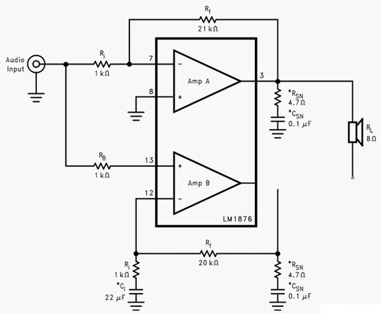 | LM1876 是一个立体声音频放大器,能够在4~8欧负载上每声道输出20W的连续功率,且谐波失真小于0.1% 供电范围20V - 64V (+和-相加,即相当于+_10V至+_32V)经典应用电路图如下 BTL应用电路下,可以输出40W左右的功率。 |