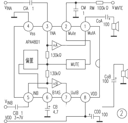 | APA4800/APA4801是Anpec公司生产的SO-8或DIP-8塑封甲乙类立体声音频放大器IC,主要应用于便携式数字音响、PC和话筒放大器等。 用APA4800驱动的立体声290mW、8Ω音频放大器电路如图1所示。APA4800内置放大器A和B,其同相端(INA+,INB+)连接在一起,并施加1/2VDD的参考电压(VRFE)。dianyuan电源电压范围为3~7V,空载dianyuan电源电流为205mA(VDD=5V时)。两路输入VINA、VINB经CiA、RiA和CiB、RiB分别施加到放大器A和B的反相输入端INA-和INB-,①脚和⑦脚上的两个输出信号分别经耦合电容COA和COB施加到负载RLA和RLB。连接IC①脚与②脚及⑦脚与⑥脚的CCA、RCA、和CCB、RCB分别为A和B的频率补偿元件。信噪比(S/N)达100dB,总谐波失真加噪声与信号之比率〔(TTCL HD+N)/S〕为0.15%(典型值),压摆率为5V/μs,dianyuan电源纹波抑制比(PSRR)为55dB,工作【温度wd】范围为-40~+85℃。 用APA4801作为驱动器的280mW、8Ω立体声音频放大器电路如图2所示。与APA4800比较,WAPA4801集成了电阻分压器,从而消除了外部电阻。同时,APA4801还带有优异的无噪声调整之功能,实现柔性无噪声调节和无开关咔嗒声。IC的Mute脚(②脚)的功能是使芯片控制输入失能(disable)。当Mute脚为“H”时,扬声器动作;为“L”时,使声音继续减弱(Mute on)。IC在VDD=5V和无载下dianyuan电源电流IDD=2.5mA时,待机电流仅为150uA,Mute脚输入电压为0.8V,无噪声调节衰减(ATT)为75dB,(TTCL HD+N)S=0.1%,S/N=100dB,压摆率为5V/μs。在10%(TTCL HD+N)上进入8Ω负载的输出功率为280mW;当RL=16Ω时,输出功率是160mW。dianyuan电源电压纹波抑制(PSRR)=76dB。 放大器输入电容(CiA、CiB)的数值影响电路的低频性能。若Ci与IC内130KΩ电阻形成的高通滤波器(H长虹PF)拐点频率为fc,则有Ci=1/(2π×130kΩ×fc)。本电路中,Ci选用1uF的瓷介电容。 |