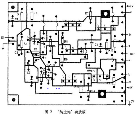 | 一、设计理念及实现方式 (1).能推4Ω、2Ω等双低音的“大食”音箱以及专业类大粗音圈的各类专业箱。 (2).要省电、噪声小,发热量小。 (3).音质要好,能适合家居使用和专业使用。 第一点的实现就是要有大的推动功率。由于目前居室客厅面积有不断扩大的趋势,100W ×2以下功放已显得有些“力不从心”,所以本功放设计为4ΩQ时360W ×2,2Ω时720W ×2。 第二点的实现就是电路工作在静态时的乙类小电流,靠大水塘级电容和电阻进行滤波降噪,使功放级噪声极小。而电路的工作状态又决定了电路元件的发热量很小,与一般乙类电路相当。配备的大型散热系统是为了应付连续大功率、低阻抗输出时的安全、可靠。 第三点的实现是本功放板的主要目标。目前公认的是:甲类、MOS、电子管音质好,所以本功放要达到甲类、MOS、电子管的音质。 二、大功率输出的实现 要实现大功率,首先是dianyuan电源容量要大。本功放配置的dianyuan电源是在截面积为35mm ×60mm的环形铁心上绕制的环牛。一次侧为1.0mm线绕484圈,二次侧为1.5mm双线并绕100圈。 整流为两只40A全桥做双桥整流,滤波为4只47000 uF电容+2只2.7kΩ电阻并接在正负dianyuan电源上,使电压稳定在±62V。如电压过高可减小电阻到2.2kΩ,过低可加大电阻到3kΩ,功率用3W以上的。 除dianyuan电源外,要实现大功率输出,特别是驱动“大食”音箱,要求功放输出电流能力要强,本功放每声道选用6对2SD1037管做准互补输出,可驱动直流电阻低达0.5Ω的“大食”音箱。所以4Ω时360W×2、2Ω时720W×2是有保障的。 三、绿色环保概念的实现 对本功放来说,实现低耗电、低噪声污染、低热辐射污染是通过以下措施实现的: (1).本功放空载时只有小电流级工作,而功率管基极电压只有0.45V,基本上是截止的,所以比一般乙类耗电少,属节电型功放。 (2).本功放由于上述静态原理决定了低热量,所以热辐射很小。噪声更小,即使耳朵贴在音箱上也只能听到轻微“咝”声,比一般耳机噪声还小。 四、甲类、MOS、电子管音质的实现 目前人们公认的甲类、MOS、电子管的音质最好,所以本功放电路设计动态时工作于甲类的最佳状态,偏流随信号大小而同步增减,所以音质是有技术保障的。而在此工作状态下,即使更换几只一般的MOS管,对音质的提高也不明显。下面给出其原理图,如图1所示。从图1上可见到本原理图相当简洁,比一般乙类或甲乙类准互补电路还节省元件。而通过在电路板上改变一只电阻的接法就可方便地在本电路与准互补乙类或甲乙类之间变换。 由于本功放板简而又简的走线,很容易手工制作。笔者用刻刀制作底板线条并在焊点上钻Φ1.2mm孔,用内径Φ0.8mm铜铆钉焊好,使本电路板这一技术载体成为了一项“纯土炮”级制作,而可双面焊接、反复焊接不会损坏电路板,为反复调整更换元件带来极大方便。两块“纯土炮”功放板如图2所示,4条功率管分流板如图3所示。 元件参数列于附表。只要按图施工,零件合格,百试百灵,无任何可调电阻。 附表 元件参数表 需要重点提示和指出的是: (1).板上所用电解电容用国产CD26型即可,而不要用钽电容,以免影响层次感和高频。用发烧级电容更好。 (2).20pF反馈电容和300pF电容均用耐压100V国产云母电容,而不要用瓷片或涤纶电容,以免产生杂波和相移。 (3).0.047uF电容可用聚丙烯类品种,而不要用涤纶类,以免高频变散变软。 (4).所用晶体管都是常用品种,如用其他型号品种请注意元件参数和安全性。 (5).板上所有元件数值越精确越好,特别是电阻和配对使用的管子。 (6).由于末级使用了多达24只功率管,所以散热片应设置大形的。笔者每一臂管子(6只)用一条35mm×100mm×450mm的黑色铝合金散热器,并将其固定在一片由730mm×480mm铝板加工成的上盖板上,用4Ω或2Ω音箱放音时,一般音量下几小时后依然是“冷冰冰”。 (7).本功放所有【存储器数据】测试均为DT890B数字万用表测得。 |