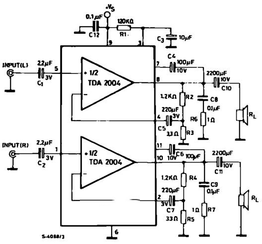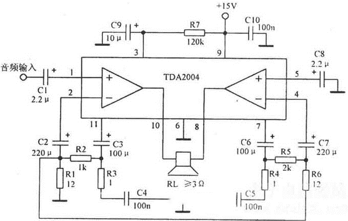 | TDA2004功放主要参数及实用电路图 TDA2004,音频双功放,单列ll脚封装,输出电流大,负载阻抗低。dianyuan电源电压8—18V。当Vcc=14.4V,Rl=1.6Ω时,输出功率Po=11W×2,Rl=4Ω.Po=6.5w×2。典型应用图如下: 引脚功能图 典型应用电路 |