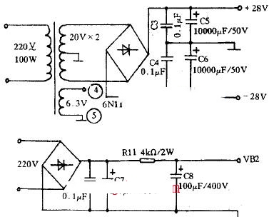 | 电子管扩音机以其温暖柔和,饱满甜美的音色吸引了一代又一代的音响爱好者。但它也有一个致命的弱点:输出阻抗高,须用输出变压器才能与普通音箱相匹配,但一款质好的输出变压器价格很昂贵,往往使广大“发烧友”望而止步。这也许就是电子管功放普及率不及晶体管功放高的原因之一。 可是如果在输入级采用电子管而在末级输出部分采用晶体管将会出现什么奇迹呢?让我们来试一下吧。 图1是笔者最近采用国产胆管6N11设计的一款胆石混合式功放,对于广大“胆”机爱好者也许会起到抛砖引玉的作用。图2为dianyuan电源电路。 本着简洁的原则,输入级部分采用6N11组成并联调整式推挽放大这一电路形式(即SRPP形式),这种电路原设计是在电视领域作高频输入级的,后来用于音响领域。该电路的失真度、动态范围等均优于三极管甲类放大电路。特别是对7 kHz以上的信号放大要优于三极管放大,这就弥补了胆机高频响应不易做好这一缺陷。 功放后级采用OCL电路,由一对大功率对管组成。管子型号为:MJ11032和MJ11033,是美国MOTOROLA公司生产的管子。其BVeco为120 V。最大输出电流50 A,耗散功率300 w,特征频率为30 MHz。 元件选择:6N11选用北京曙光厂产品,可用6DJ8,6922等直接代换,当然也可用音色暖,且价格只有6N11一半的6N3代替,但这速度要慢许多。R3、R4zuzhi阻值误差控制在99.9%以内为好。方法是通过测量A点的电压值,看是否为VB2的一半。耦合电容C1最好选用耐压大于450 V的MKP电容,也可用WIMA电容或洗衣机中的CBB启动电容代替。电阻除注明外,其余选用1/4 w金属膜电阻。MJ11032和MJ11033应选用美国原装产品,而市场上出售的印有“MEXICO”字样的管子,使用效果较差。 灯丝若采用交流供电其听感比较醇厚,但交流声不好处理,这时可用灯丝一端接地的方法予以解决。 由于本功放电路简单,为了尽快完工,笔者全部采用搭棚焊接的方式进行连接,结果也没有出现本底噪声。静态时,在距扬声器1 m远处听不见任何噪音。 试听后给人的总体印象是:音色醇厚饱满,使人久听不厌,用普通CD机作音源时,完全没有“数码”声,声音自然流畅。 |