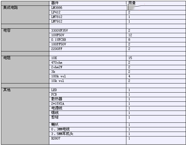 | 电脑用的功率放大器 许多玩音响的前辈一看到这个题目必然会抚袖而去,因为这个题目随便在那个杂志上,遍地都是,再写这个题目,难免会有老掉牙之嫌。但此文却有些不同,他是本人多次试验的结果,可能会对初出道的朋友有些帮助,如果是前辈大虾们,自然可以略过不看。 谈起音响来,以前看过一篇大作,题目不记的(大约是无线电与电视吧?)其间有一句话印象颇为深刻,很痛心疾首的样子:“许多初出道的哥们,一玩音响便是把均衡器调成V字形,仿佛这样一来,低音也下去了,高音也上来了,简直是神仙也劝不转”当时我也极为汗颜,因为我就是这个样子,从下文可以看出,我所介绍的这个东西,不仅是要调成V字形,而且是要调成“vv”形,简直要把此人给气死。我想造成这种状况的原因有二: 一是我等初哥学识浅薄,水平有限,不能体会原音的妙处,二是人太穷的缘故,玩不起高档喇叭。中音是音响的灵魂,也是最难做好的地方,低档一点的尤甚,听起来噪的很,如同锯水管一般。如此一来,只好把均衡器调成V字状,把中音压一压,这样才顺耳一点点,君不见无论是日货音响,还是国货音响,都是”BASS” “SUPPER BASS”的贴的到处都是么?好了,丑媳妇总是要见公婆,让我带大家来见见我这个“S-BASS”的放大器吧! 定睛一看,电路毫无出奇之处,就和抄人家的一样。当然,我不敢和前辈高手相比,能抄一抄人家的已是很满意了。另外,为了节省版面,我只画了一个声道,余下的和上面相同。为了电路的制造方便,我稍稍篡改了一下,把许多元件选成一个样子,这样大家就不必翻箱倒柜了。 从元件的选取上,我稍花了一些心思,主放大器采用了美国NS公司的序曲系列LM3886TF,该芯片经我多次测试,其性能自然是无可质疑的,譬如:0.04%的TTCL HD , 13V/us的速度等等,用来做放大器无疑是省时省力省钱的好办法。前级运放则采用了LF412该芯片在10KHZ 的方波测试中,表现颇佳,而相反曾在前几年极度辉煌的皇牌放大器NE5532则早已振铃的一团糟了,而价钱亦便宜,不过RMB5元,其他元件而言,电阻均采用了1/4W 五环金属膜,小电容全部是CBB,大电容则采用了日本的红宝石牌(决非笔者崇洋媚外,因我在工厂作物料品质工作,大量的测试表明,进口器件的性能决非国货可比,而好的器件必定会带来电路好的整体性能,尤其是低频放大器),但是,千万不要陷入极品材料论的乖怪圈,否则会产生意识上的混乱,譬如:“6N无氧铜线与5N无氧铜线的音色差异?!!”之类高论。实在令我等战战兢兢,不敢说话了。 1.工作电压的选取 我采用的是AC2*15V,而不是标准的AC2*28V, 实践证明,在AC2*28V供电的情况下,芯片的发热很严重,非要大型散热器不可,而在实际使用中,我们做的是MPC,而不是HI-FI 功率用不了那么大,取2*15V一个小散热器就可以了,譬如我用的就是一个CPU 的散热器。这里也许有人会问,既然不用那么大,那么我用一个TDA3030不就可以了吗?我想我们不可以因为节约10元钱而降低对性能的要求,无论在何种情况下,LM3886的性能将高于TDA2030,这是绝对的。 2.噪音的防治 由于PC机内严重的电磁污染,会导致我们的放大器的背景混浊,无法同CD相提并论,实践证明,最重要的污染来自于硬盘读盘时对声卡的污染,如果我们在硬盘供电回路串一个滤波器,效果简直立竿见影。如图所示: 整机地线走向问题也是极其重要的,地线设置不当,极易带来无法排除的噪音甚至是自激。良好的底线走向往往比加屏蔽效果明显的多,这个问题一言辟之,就是星形接地,大家只有实践,实践,再实践。具体到PC机而言,如果你用的是 PCI显卡,那么请用ISA 1816声卡,如果你用的是AGP显卡,那么也请用ISA1816声卡。为什么呢?因为如果在总线公用的情况下,会带来信号污染,这里也许有人会问?这位老兄为啥这么喜欢1816? 3.电容的极性: 电解电容的极性反了,再滤波电路里,会引起爆炸。在耦合电路里,情况也不会好到哪里去,首先是会自激,一瞬间烧掉喇叭或IC.所以在大家做的时候一定要注意C1,C2,C3……的极性。(这个问题本不该谈,也许太小儿科了,但是,据我所知道,很多初学者极易犯类似的错误。) 4.电位器的问题: 国内的许多电位器用了不到一个月,就卡, 卡,卡,的响个不停,而误差更是达到20%甚至是50%以上。如此一来,我们前面所作的工作就算是白干了,你总不希望你的宝贝只能用一个月吧?而日本货又贵的吓人,直流音量控制, 我总觉得是不伦不类的东西, 所以直接用软件控制,还免去了若干连线。各位如果是富家子弟,倒可以用ALPS的电位器一试。高低音电位器我用的是松下的可调电阻, 一次调好,永不变更。(事实上,我以为, 经常调整音调电位器简直是一种恶习.) 5软件: 有的时候你辛辛苦苦把电路装好,却发现一个声道怎么也没有声音,原来是WINDOWS的音频属性里把一个声道给关了。这种情况也时有发生,不同的接压软件, 其算法不一样,音频效果也是不同的, 比如XINMPEG不如STHVCD5.5,而在MP3方面, 自然是WINAMP为第一了,其效果又比STHVCD5.5的超级音频解霸胜出一筹。 说道这里, 我们的放大器也做的差不多了,在机向箱里钻几个洞,固定好变压器,输出插座,以及电路板,(千万不要偷懒,烧了主板可别怪我。)连上音箱,就可以试机了, 你会发现,“音色之妙,令人惊讶”?提起音箱来,这个问题颇沉重,还是等我们有钱的时候再谈吧。如果你在制作中有什么问题, 可以给我发emall过来,或者直接给我的主页留言,我会不遗