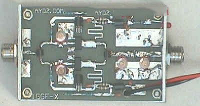 | BFG591是一支很超值的小功放管,当用一支这样的管子作功放输出略显不足时,用两只管子并联工作也不失为一种好办法。所谓功放管并联工作,并不是将管子的三个电极并在一起接入电路就能很好工作的,即便是在纯直流状态下也还有个管子配对、均流的问题呢,更何况是在频率较高的交流状态下了。 这款功放管并联的功放主要为了与800MHz频段袖珍式电视发射机配套,作功率接续之用,设计在800MHz以上工作,工作电压12V,电流350mA附近,在800MHz的增益大于10分贝,电原理图见下左,下右为印板图。 由图可以看出,两管的直流电路是相互独立的,发射极直接并联,基极和集电极分别通过隔离线圈同相位连接,完成整个两管的并联工作。 做好的成品放大器如下图所示。 这款放大器主要用于只能采用12V供电的场合,例如800MHz频段袖珍式无线影音发射器,还有用373芯片做的UHF无线影音发射器等,当采用12V蓄电池供电的时候,若是嫌输出功率略显不足,可采用这款放大器作为功率接续,输出功率将会提高1-2倍,能够明显改善传输效果。 |