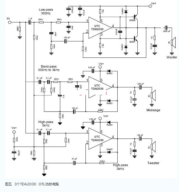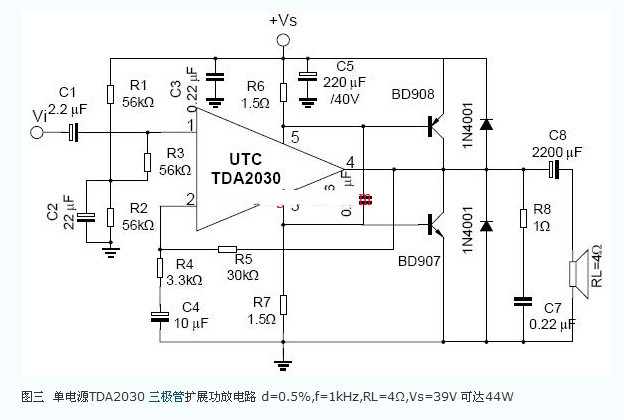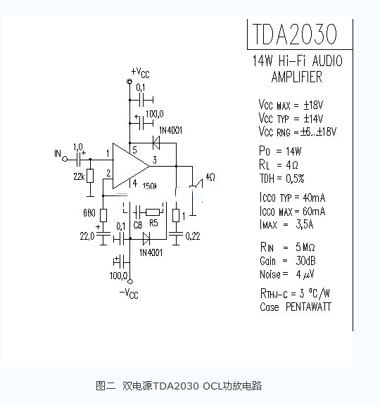 | TDA2030是许多电脑有源音箱所采用的Hi-Fi功放集成块。它接法简单,价格实惠。额定功率为14W。dianyuan电源电压为±6~±18V。输出电流大,谐波失真和交越失真小(±14V/4欧姆,THD=0.5%)。具有优良的短路和过热保护电路。 电路以TDA2030为中心组成的功率放大器,特点有:失真小、外围元件少、装配简单、功率大、保真度高等,很适合无线电爱好者和音响发烧友自制,学生组装。特意提供TDA2030功放电路图. 工作原理: 电路中D1—D4为整流二极管,C11为滤波电容,C12为高频退耦电容;RP1为音量调节电位器;IC1、IC2是两个声道的功放集成电路;R1、R2、R3、C2(R7、R8、R9、C7)为功放IC输入端的偏置电路,本电路为单dianyuan电源供电,功放IC输入端直流电压为1/2dianyuan电源电压时电路才能正常工作;R4、R5、C3(R10、R11、C8)构成负反馈回路,改变R4(R10)的大小可以改变反馈系数。C1(C6)是输入耦合电容,C4(C9)是输出耦合电容;在电路接有感性负载扬声器时,R6、C5(R12、C10)可确保高频稳定性。 信号流程: 音频信号从X1输入经音量电位器RP1,再由C1(C6)耦合,进入IC1(IC2)的1脚,由集成电路放大后从4脚输出,经输出耦合电容C4(C9)到达X2。 二、性能参数 输入电压:AC≤18V DC≤24V 输出功率:Po=15W+15W(RL=4Ω) 输出阻抗:4—8 Ω双dianyuan电源供电BTL音频功率放大器[attach]73708[/attach] 工作原理: 用两块TDA2030 组成如图1所示的BTL功放电路,TDA 2030(1)为同相放大器,输入信号Vin通过交流耦合电容C1馈入同相输入端①脚,交流闭环增益为KVC①=1+R3 / R2≈R3 / R2≈30dB。R3 同时又使电路构成直流全闭环组态,确保电路直流工作点稳定。TAD 2030(2)为反相放大器,它的输入信号是由TDA 2030(1)输出端的U01 经R5、R7分压器衰减后取得的,并经电容C6 后馈给反相输入端②脚,它的交流闭环增益KVC②=R9 / R7//R5≈R9/R7≈30dB。由R9=R5,所以TDA 2030(1)与TDA 2030(2)的两个输出信号U01 和U02 应该是幅度相等相位相反的,即: U01≈Uin·R3 / R2 U02≈-U01·R9 / R5 ∵ R9=R5 ∴ U02 =-U01 因此在扬声器上得到的交流电压应为: êUYç= U01 -( -U02)= 2U01 = 2U02 |
