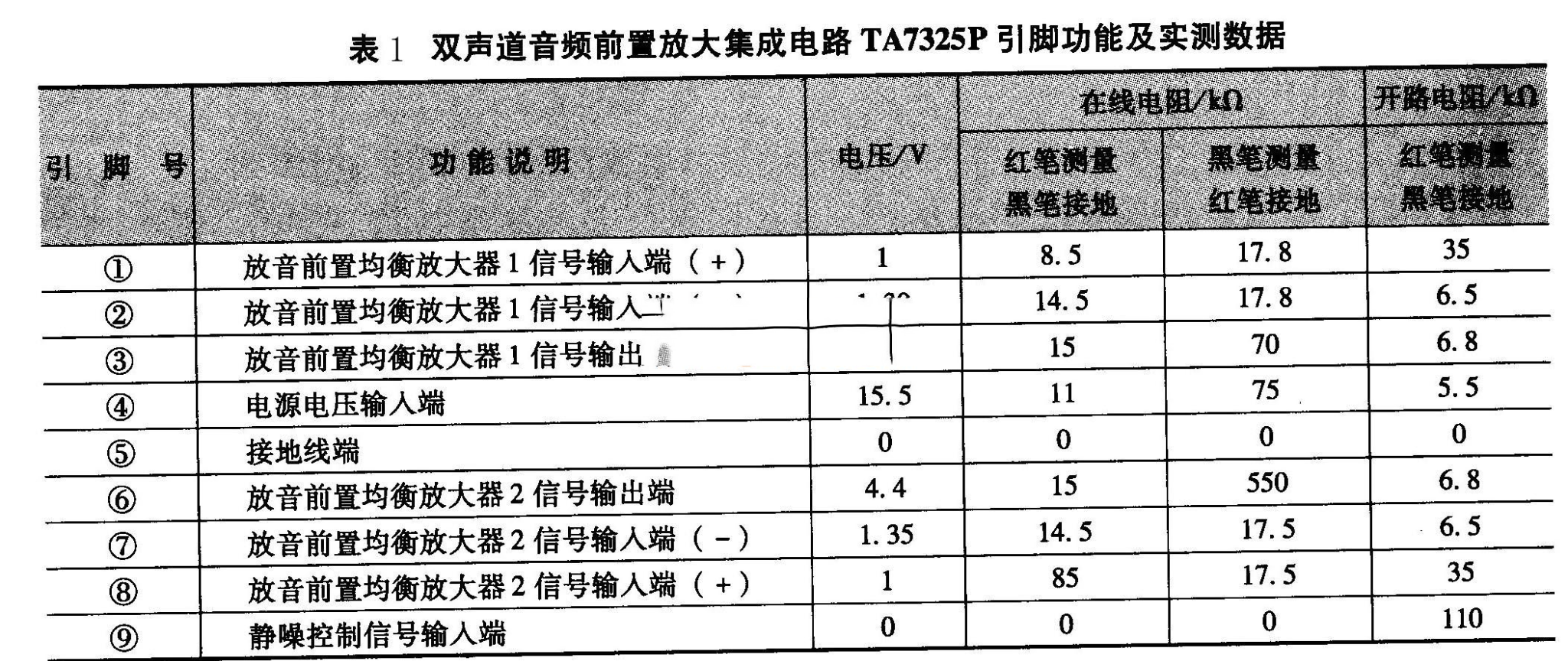 | 中渝S5000型调幅/调频立体声收音、放音汽车音响,收音功能正常。用磁带放音时,右声道无声,左声道声音正常。 分析思路: 中渝55000型汽车音响主要以三块集成电路为主构成。相关电路如图1所示。其中;IC1 (TA8127N)为AM和FM收音单片集成电路,用以完成AM波段收音和FM或FM波段立体声收音的全部功能;IC2 (TA7325 P )为左、右设定放音信号均衡放大集成电路,用以对磁头拾取的信号进行放大和对频率进行补偿;IC3 (TDA2004)为左、右设定音频功率放大集成电路,用以对收音或放音信号进行放大后推动扬声器发声。 该机收音电路信号由IC1 13、14脚输出,分别经EC6、EC7及R11、R12加至音量平衡电位器RP3的两端;放音电路信号由IC2③、⑥脚输出,分别经EC25、EC24及两只耦合电阻,也加至音量平衡电位器RP3的两端。 由以上分析可看出,音量平衡电位器RP3及其以后的音调控制电路(SA3-1、C11与SA3-2、C12)、音量控制电路(RP2-1、RP2-2 )、功率放大电路、扬声器电路是收音和放音电路的共用部分。由于该机收音功能正常,说明这部分收音和放音的共用电路是正常的。问题仅存在于放音有关的电路中。 该机左、右设定放音信号均经过IC2处理后输出。IC2 (TA7325P)集成电路各引脚功能及实测数据见表1。由于该机左声道放音正常,说明IC2集成电路的供电电压是正常的,问题又可缩至磁头(指右声道)→右声道均衡放大电路→R41电阻之间的电路中。 检修思路: 1.判断故障的大概部位 由于故障表现为是左声道放音正常,故障集成电路TA7325 P的左、右声道功能对称引脚的电压值进行对比测量,结果发现③脚电压高达6V,而对称功能的⑥脚电压为4.4V左右。究其原因,除了TA7325 P集成块本身损坏外,①、②、③脚的外围元件不良时,也会引起③脚电压升高,应进一步对①~③脚的外围元件进行检查。 2.查找IC2③脚电压升高的原因 (1)对IC20①、②、③脚外围元件进行仔细检查。发现其②脚外接的交流反馈电解电容EC22 (22μF)的反向电阻只有30kΩ左右,属不正常;而正向电阻为800kΩ左右,与正常值基本上差不多。 (2)干脆将一只新的22μF/10V电解电容器焊在EC22的位置,③脚电压下降为正常的4.4V左右,这时右声道放音也恢复了正常。由此说明,故障就是原EC22不良引起的。 3.确诊原EC22是否不良 为再次证实故障原因,试将原电解电容并接在新换的电解电容两端时,IC2②脚电压马上就从1.4V下降至1.1V左右,只差0.3 V,但③脚电压则从4.4V上升至6V左右,音量也明显下降。说明故障是因为原EC22电解电容不良引起的。 维修总结: 故障主要是由于EC22电解电容器不良引起的。由此说明,在测量电解电容时,对其正、反向电阻都要细心地进行检查,要特别注意表针最后所返回的位置,对不同容量值的电解电容器,平时还应多积累一些经验数据,这样的积累会使日后的维修事半功倍。 |