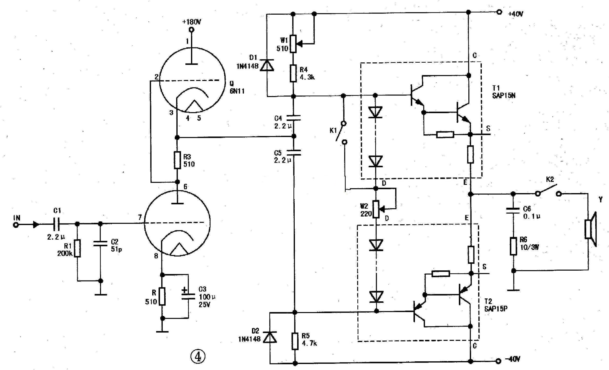 | 00 2.采用2SK135/2SJ50场效应互补对管 2SK135/2SJ50 MOSFET型场效应互补对管是日立公司专为音响开发的。它克服了因VMOS型场效应管导通电阻大、结电容大,采用它们制作的音响高频失真大、声音粗糙的缺点。该对管主要电参数为:VDS为±160V,VGS为±14V、 ID为17A、PD为100W。为17A、PD为100W、RT为110ns。与场效应管复合的互补对管分别为2SC2275A、2SA985A,其主要参数为:Vceo为±150V、Icm为±1.5A、Pcm为25W、fT为200MHz,由它们构成的胆石混合功放电路如图2所示,调试方法及数值与图1相同。 由于该对管具有开关速度快、在大电流下具有负温度系数特性、无二次击穿、仅需电压驱动、偶次谐波丰富,故该功放表现颇佳,音质温润。在聆听古典音乐、轻音乐、小夜曲、民乐等方面表现非凡,尤其是弦乐与人声方面是功放管采用双极型晶体管所无法比拟的。所以,笔者以为该功放是喜欢欣赏音乐的爱好者的明智选择。顺便提及,与上述场效应互补对管相似的型号还有:2SK132/2SJ47、2SK133/2SJ48、2SK134/2SJ49等。 3.采用2SC2922/2SA1216双极型互补对管 2SC2922/2SA1216互补对管是日本三肯公司生产。一其主要电参数为:Vceo为+180V,Icm为±17A、PC。为200W、fT为50M8z。与2SC2922/2SA1216进行复合的互补对管采用的是2SC2238、2SA968,其主要参数为:Vceo为±160V、Icm为±1.5A、Pcm为25W、 fT为100MHz,由它们构成的胆石混合功放电路如图3所示。 末级电源电压取±45V,调试方法与图1有所不同,调W1使2SC2922集电极静态电流为150~200mA,调整R4(可先用20kΩ电位器调好后再换成固定电阻)使输出点对地电压为0±0.3V,注意此时扬声器断开。反复几次,直至通电1~2小时后,电流、电压值仍符合上述要求为止。该功放具有三肯管独有的纯正音色,音质明亮,明亮中带有细腻。高音清丽而不刺耳,低音厚实有力而不拖泥带水。如果元件选择上乘,电路布局设计合理,该电路可达Hi-Fi水准。图3中的功放管还可选择东芝公司生产的2SC2565/2SA1095互补对管。该互补对管参数为:Vceo为±160V、Icm为±15A、Pcm为150W、fT为90MHz。 4.采用SAP15N/SAP15P达林顿互补对管 SAP15N/SAP15P达林顿互补对管,是日本三肯公司推出的另一种音响达林顿互补对管。共有5只引脚,其中多出的二只脚一只为偏流二极管引出脚D,另一只为内部发射极S(内接电流控制电路)。该对管主要电参数为:Vce为±160V、Icm为±15A、Pcm为150W、fT70MHz。管内设有电流控制及温度补偿电路,使放大器无论是动态或是静态均能自动稳定工作点,保证功放始终工作在最佳状态。由它们构成的胆石混合功放电路元件极少,如图4所示。 末级电源电压仍取±40V,图中W2是静态电流调整电阻。当开关K1断开时,机器工作在甲类状态。调整W2,使SAP15N C极电流为150m A~250mA;调整W1使中点(即图中E点)对地电压为零。当开关K1合上时,机器工作在甲乙类状态。调整W2,使SAP15N C极电流为25mA~30mA;调整W1使中点对地电压为零。实践表明,当功放工作在甲类状态时,音色甜美圆润。当功放工作在甲乙类状态时,音色亮丽清纯。不论是处于哪种工作状态,总体感觉是低音强劲有力、中高音清晰明亮,悦耳动听,失真都很小。绝对比纯石机音质强多了。 最后要说明的是,上述几款胆石混合功放电路均未加大环路的负反馈来稳定其工作点,全靠元件的性能来保障。因此,除元件要是上品外,对管参数要严格保证一致。上下配值一样的电阻、二极管,电容的数值也要严格一致,最好用数字万用表和专用电容表挑选。电阻采用金属膜电阻,除注明功率的外,其余均为1/2w,无极电容建议采用音响专用的聚苯乙烯电容(MKS)或聚对苯二甲酸醋电容(MKT )。因这类电容具有热稳定性好、频率特性好、正切损耗值小、漏电小、等效电感小及耐压≥160V等优良特性,对保证音响高品质音质起着重要作用。 另外,在推动级的胆管采用的普通民用级管6N11,若采用军用级6N1 1J或进口管6DJ8效果可能会更好些。功放管若采用其他不同类型或型号的,可能还会有不同的音色表现,这有待音响爱好者去尝试,并根据各人喜爱决定选用哪一种具体电路。 12 / 2 页 |