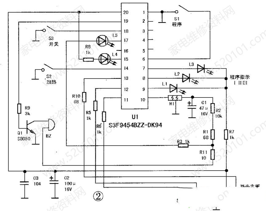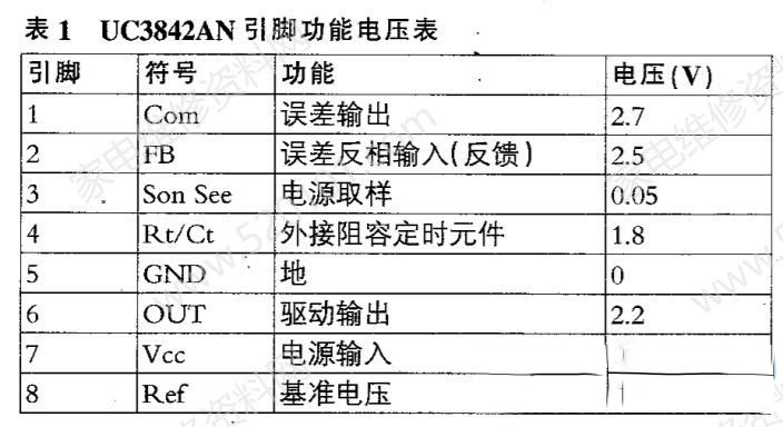 | 本文以一款从网上购买的足疗机为例,浅解其电源工作原理及检修实例。整机实绘电路图见图1、图2。该机的电源电路是以U2( UC3842AN)为中心的开关电源。UC3842AN具有PWM闭锁保护、推挽放大、电源欠压保护、基准电压发生器、振荡器、误差放大器、电流比较器等功能。 一、工作原理 220V市电经D1~D4整流、C2滤波,得到的300V直流电压一路经开关变压器T1的①-②绕组进入Q1的漏极;另一路则经R4、R11降压后对C4充电并进入U2的⑦脚。当C4两端电压达到16V时,⑦脚内部电路启动工作,从⑧脚输出基准5V电压,该电压经R10后对C7充电并进入④脚,当C7上充入一定电压值时对④脚放电,④脚内部电路开始工作并送到内部的振荡器,从⑥脚输出控制的开关脉冲信号至开关管Q1的栅极,控制其导通状态。当开关管Q1工作后,在T1的③-④反馈绕组上的电压经D6整流、R11降压后产生的18V电压取代初始启动电压而为U2的⑦脚供电。在开关变压器T1次级输出24V直流电压供整机负载使用。 欠压保护:当U2⑦脚电压低于10V时,U2不能启动,⑧脚也无5V基准电压输出,开关电源无输出;当U2已启动工作,但由于负载过重或相关元件损坏、变值等原因使T1反馈绕组的电压降到10V以下时,⑦脚内部触发器工作,使⑧脚无5V基准电压输出,U2便停止工作。 过流保护:设在开关管Q1源极上的电阻R1有双重作用,既用于稳压调压控制,又用于电流取样。当由于某种原因使Q1源极电流增大时(如负载短路等),在R1.上的压降也增大,同时U2的③脚电压也随之上升。当③脚电压,上升到0.5V以上时(多数该块的③脚电压在1V时),⑥脚便无开关脉冲输出,整机停止工作。 二、实例检修 例1:整机全无。通过检测发现F1、RT1均已断路,进一步检测又发现D3短路,其他元件无异常。将F1、D3换新,由于RT1无原规格配件,只好用0.5Ω/2W电阻替代后试机,故障排除。 例2:整机全无。测U2⑦脚只有不稳定的6V电压,U2各脚对地电阻无明显异常。拆下R4测其阻值约为800kΩ,异常。将 其换新后试机,故障排除。 例3:整机不工作。测U2⑥脚电压只有0.22V。T1次级侧有10V的直流电压,但无异常的电阻值。次级电压虽能满足CPU的工作条件,但由于电压太低,电机及加热板均不能工作。用KA3842AN代换uC3842AN后试机,故障排除。例4:正常工作几分钟后便停机。此时,整机电压均正常,按键操作指示正常,但不起作用。经细查为电机插座处有裂缝而不能转动,由于霍尔元件U3未检测到电机转动,使U1(CPU)发出停机指令。将上述故障点补焊后试机,故障排除。 UC3842AN各引脚功能及参考电压见表1。 |
