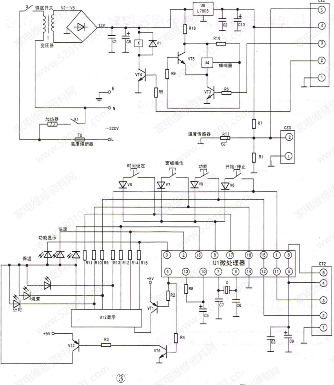 三、微处理器控制式电饭煲 这种电饭煲利用微处理器进行传感测量,控制细微的沸煮温度变化,功率在800W左右,有利于节能。图3所示为南极星CFXB40-B70T电饭煲微机控制电路。 1.工作原理 电路由电源电路、加热控制电路、蜂鸣电路、温度感应电路、显示指示电路、按键电路、微处成。放入装有食物的内锅后,开关S闭合,AC220V电源由熔断器FU、锅底开关s,经变压器T降压,V2~V5整流,C1、C8滤波后,得到12V直流电压,为加热控制电路和蜂鸣电路供电。该12V电压又经U6 稳压,得到5V电压。经插件CZ2④脚为U1电路和显示电路供电。继电器K、三极管VT4和加热器构成加热控制电路。三极管VT3、VT5和U4构成蜂鸣电路。R1、R7、温度传感器RT组成温度感应电路。RT为具有负温度系数的热敏电阻,安装在锅底总成中,用来感应锅内温度。VT1、VT2、VT6及U1④脚组成功能控制及显示驱动电路,数码管U2及发光二极管等组成显示指示电路。 放入装有食物的内锅接通电源,U1③脚为低电平(2.9V),保温指示灯点亮,进入保温状态。按动功能按键,选择需要的功能(煮饭、快速煮饭、煮粥、炖汤等),按下“开始/停止"按键,12脚输出4.6V高电平,经CT2 2脚、R5,使三极管VT4导通,继电器K吸合,其常开触点闭合,接通加热器电路,开始加热煮饭,烧煮发光二极管闪烁,数码管显示煮饭时间。每按一次按键,11脚输出5V高电平,此高电平经R6加至VT3基极,使VT3导通,蜂鸣器U4发出声音,表示按键有效。当煮饭的温度升至103°C左右时,负温度系数热敏电阻RT的阻值减小到需要值,U1⑧脚电压下降到设定值,12脚变为低电平,经R5加至VT4基极,使VT4截止,继电器K失电释放,其常开触点K1复位断开,切断加热器220V电源,停止加热。按下时间设定按键,可以设定煮饭的时间。在煮饭过程中,按下“开始/停止”键,可以停止加热,进入保温状态。 2.常见故障 (1)接入电源,电饭煲不加热无指示显示的电源故障多数为温度熔断器烧断,锅底开关触点接触不良,或整流二极管开路。 (2)电源电路无异常,按动各功能按键,微处理器U1的全部功能失效这可能是供电接插件触点接触不良,未能向U1输送5V工作电压;可能是u1⑥、⑦脚振荡电路损坏导致微处理器不能正常工作。如果复位电路有故障,也可造成微处理器功能失效或功能紊乱。 (3)微处理器局部功能电路失效,其余功能正常用万用表检测这些引脚对地电阻或对地电压,以及这些引脚外围的电元件,应能找出故障点,微处理器U1引脚实测参数见表1。 3.检修实例 (1)插上电源插头,电饭煲指示灯不亮接上AC220V电源,指示灯不亮,电饭煲无反应,问题多数出在电源电路。应首先检测电源插座有无220V电压、插座铜片有无变形。插头上有无烧蚀的污垢,用表测量温度熔断器,未烧断,阻值为0Ω。当测至锅底开关S时,将其人为压下闭合,表针指示为无穷大。拆开开关S,观察其已烧蚀。用小刀刮去烧蚀点并用细砂纸擦拭干净,用表测量阻值为0Ω。将其重新装好后,通电,整机恢复正常。 (2)电饭煲不加热,其余功能正常 这是加热控制电路故障,由电路原理可知,U1 12脚输出高电平,VT4才会导通,接通继电器K电路,电饭煲才会加热。按下“开始/停止"按键,用表测量u1 12脚有无4.6V电平。若有,测量VT4基极电阻R5两端对地电压,R5并无开路,再测量VT4集电极对地电压为0V,判断可能是继电器K线圈断路。断电,测继电器K的线圈电阻为无穷大,证明已断路,用规格相同的继电器更换之,电饭煲能正常加热。 (3)电饭煲能加热,但饭煮不熟经试机观察,电饭煲未到设定时间就进入保温状态,加热器电源被提前切断,导致饭煮不熟。由电路原理可知,在时间设定后,随着加热时间的增长,锅内温度升高,U1⑧脚电压下降到设定值时,12脚变为低电平0V,VT4截止,切断加热电路。温度传感器RT损坏或R1阻值增大,必然会使U1⑧脚电压提前降至设定值,使u1 12脚提前变为低电平,导致VT4截止,继电器K提前释放切断加热器电源。用万用表测量R1阻值正常,RT常温阻值为150k~200k,比标称阻值大。更换RT后,故障排除。 |
