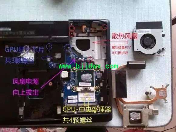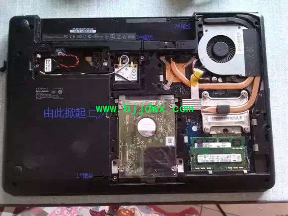 | 为了进一步消除大家对电脑的神秘感,今天奉上笔记本的拆解图片。 拆解开始 step1 先松开电脑背部的3颗螺丝,拆下电脑后盖。 注:大部分本本拆开后背后可以自行更换硬盘跟内存。 step2 松开散热片与风扇螺丝,拔出风扇电源,即可取出散热器。 step3 已拆开的散热片与风扇,可进行清灰操作了。 注:大部分本本拆开后背后可以自行更换硬盘跟内存。 另附其他图片供参考 1) 内存、硬盘、光驱与本本合影。 2) 键盘与本本合影。 3) CPU近照图。 4) 电脑主板正面图。 ps:这只是其中一种笔记本电脑的拆解图,不同品牌,不同型号差异比较大,如果你想对你的本本动手的话,可以网上先搜一下你本本的拆解图,不能莽撞,否则后悔就来不及了,记住胆大心细哦! |