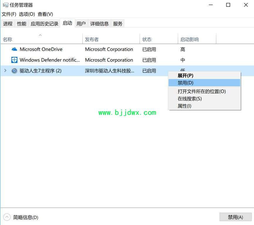 在Win10 系统任务栏【右键】进入【任务管理器】,选择【启动】选项,将显卡(N/A)所以开机启动项【禁用】 因为驱动哥是模拟机,所以里拿驱动人生作为一个例子,右键【禁用】把所有英伟达N开头的禁用,重启计算机就蓝屏问题就解决了。   第四步,如无法进行安全模式