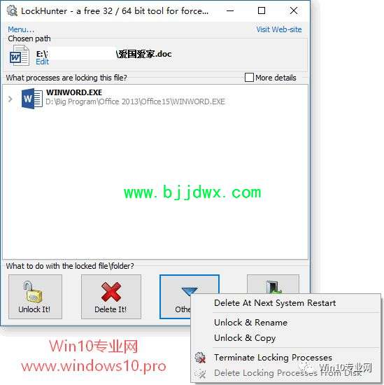 | 很多Win10用户都遇到过这样的情况,在删除或重命名、移动或个文件时,提示“文件正在使用”导致无法删除或改文件名。很多时候“文件正在使用”提示窗口会显示“文件已在***中打开”,从而让我们知道占用文件的程序,关闭该程序即可解除占用。但有些时候却没有提示到底是什么程序在使用文件,这个时候虽然重启电脑即可解除占用,但这就势必打断当前的工作。所以今天MS酋长为你推荐一款名为LockHunter的小软件,可查看占用文件的应用程序,解锁文件占用并删除或重命名文件。 LockHunter下载地址:官方网站 LockHunter安装完成后,你在被占用的文件上点击右键时,右键菜单中会看到“What is locking this file?”选项。如图: 点击该选项,在弹出的窗口中即可看到正在使用该文件的应用程序名称及路径。如图: