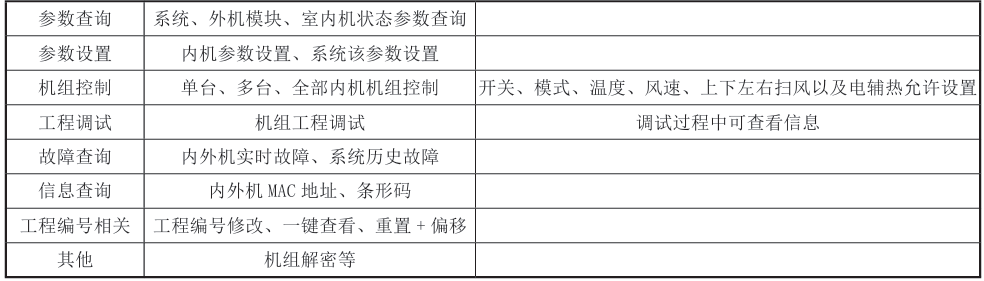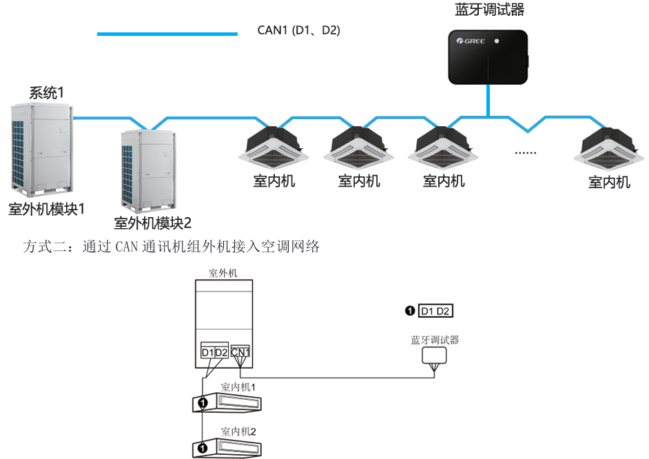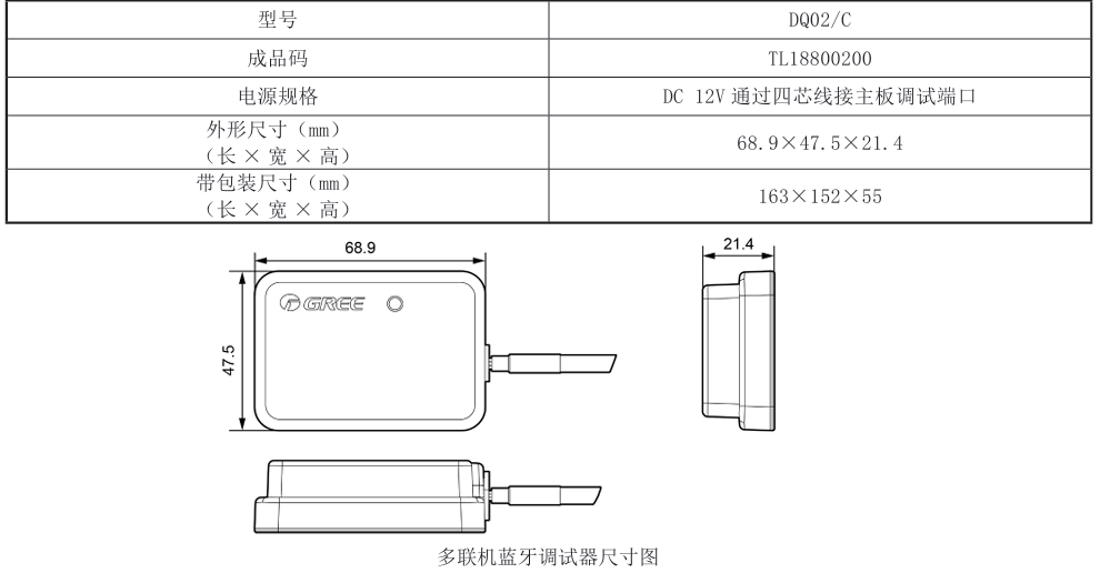 一、功能特点 面向实验人员、工程安装人员、售后维修人员使用的专业化工具,可以快速诊断空调机组故障,帮助专业人员完成空调机组的调试、维修等工作。需要有格力的派工账号才能使用,非格力售后人员,没有账号不能使用,请勿购买。 (1) 调试器自带通信线,包含标准四线通信端子,由外接设备进行供电,即插即用型。 (2) 外形精致小巧,长度仅68.9mm,轻盈时尚。 二、和空调连接简要说明 1、尺寸和部件 2、接线说明 蓝牙调试器自带4芯通讯线,直接连接机组主板调试端子CN11或CAN1。 针对不同类型机组产品,本产品通过如下两种方式接入机组网络: 方式一:通过CAN通讯机组内机接入空调网络 3、APP主要功能介绍 参考图片如下: 三、使用范围 参考适用机型 |