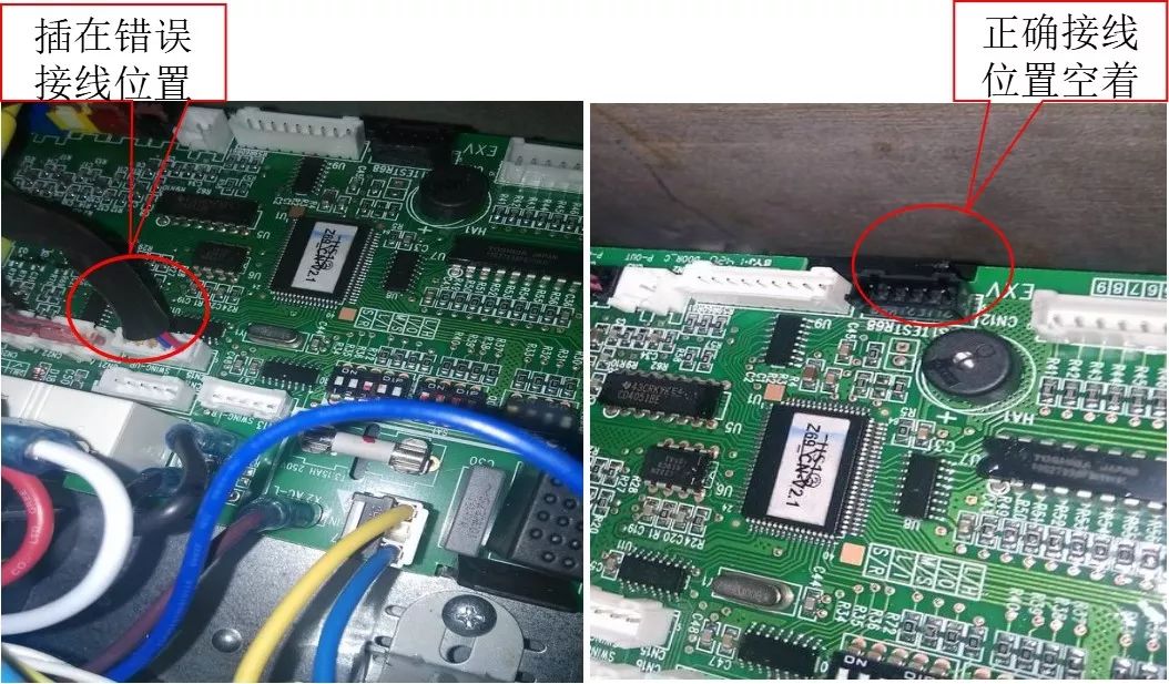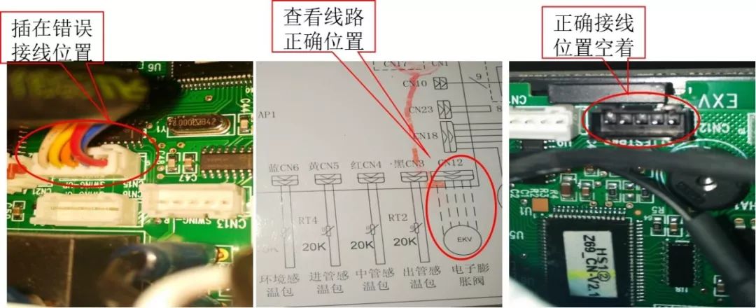 个别机型(NaE系列)电子膨胀阀线圈插错位置同样会出现电子膨胀阀不受控。正确的位置是CN12,安装人员却插在了CN9上,最夸张的一户四台内机,四台全部插错了。 结论:有室内机电子膨胀阀不受控制,一直在漏液,如果不开这台室内机,开其他的机组运行久了就会出现n4保护,如果用户开这台室内机,同时再开其他内机机组就不会保护。室内机漏液后造成制冷剂不能充分蒸发,压缩机吸气带液,排气温度过低就会报n4(过冷煤保护)。 那么如何查询内机电的方法不受控的?需要打开电器盒去检验一下它的插件有没有插错位置?有些机型主板上有多个五芯插孔,就像上面图片中那样。 第三种检查机组是不是冷媒过多?