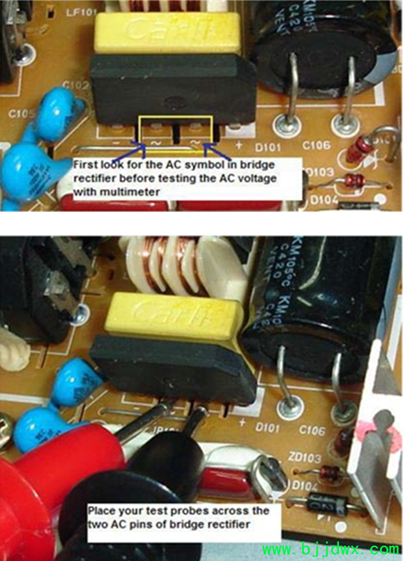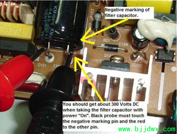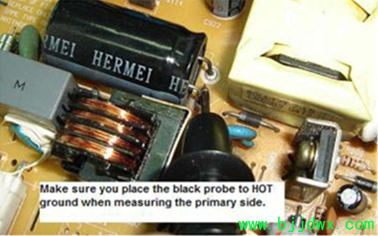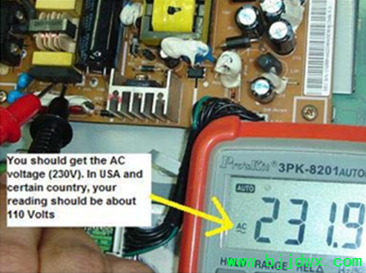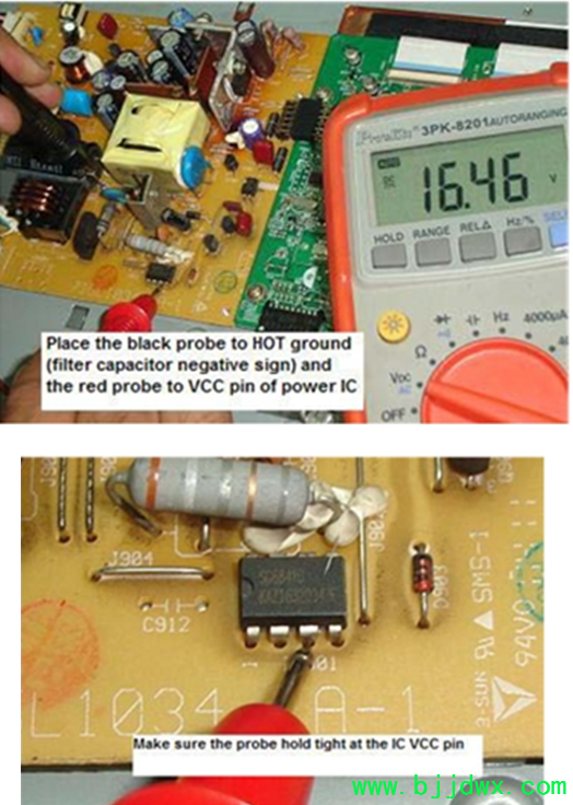液晶显示器的关键电压测试点 关键电压测试点是最快的方法,以确定在哪里发生故障的部分,甚至错误的组件位置。许多专业的电子修理使用测试 来定位故障点的准确位置。在这里,您将有机会学习电压测试和启动来确定故障区域的液晶显示器。 危险 - 在您开始测试任何点的液晶显示器,我高度建议你寻求帮助的朋友从你的经验丰富的维修,并确保未来的交流电压是由一个隔离变压器(所以它可 以保护你,以防万一,假如有任何电器震惊发生)。电力方面的治疗,并确保你完全知道自己在做什么。好让我们开始,假如您准备好了! 首 先找到桥整流,然后将整个测试探头交流引脚。严格把握测试探针,以便它不会溜走,并触及其他引脚。既然你是测量交流电压测试探针,可在任一方式。 假如你阅读约 230伏交流电(在美国是110伏特),则这证明了存在的交流电压的交流电源插座和保险丝工作。假如它是零伏,那么你要检 查前桥整流电路。这可能是一个坏的导火索;交流电源插座是没有打开“论”,联系松散,破碎交流电缆等 滤波电容电压测试 一旦你已经证实桥梁整流器交流电源输入,你现在应该预计大约 300伏特直流电(目前为美国约 150伏特直流)在引脚的滤波电容。请确保你抱紧你的测试探头,仔细谈谈电容引脚。假如您不小心碰脚而做的试验,它可能会产生很大的火花和打击的权力部 分。假如你没有信心做工作得到修复的朋友来帮助你。 黑色的探头,必须在消极方面和脚红色探针从积极的一面所示的照片。你得到的直流电压的 整流桥,因为它已经从 AC电源转换。假如你得到预期的直流电压测试,然后转移到电源电压的电源 IC,假如不解决该地区的定位,假如有任何问题与电路喜欢干接头,打破田径等 测试电源电压(Vcc)的电源 IC我使用的是另一个电源板,明确告诉你如何测试供应电压的电源 IC。首先找到的VCC引脚的电源 IC从数据手册或互联网。一旦你找到了的VCC引脚,现在探头放置红色的VCC引脚 和地热的黑色探头 (初级滤波电容的负引脚)和开关“开”的权力。你应该得到一个直流电压读数从 16到20伏(取决于液晶显示器设计)。在下面的照片,我们得到16.46直流电压。 假如你得到正确的电压这意味着,整 流桥,滤波电容和电阻的启动正在做的工作,你现在应该执行下一个测试。不要浪费不必要的时间改变的桥梁整流器,滤波电容,甚至检查启动电阻值 |