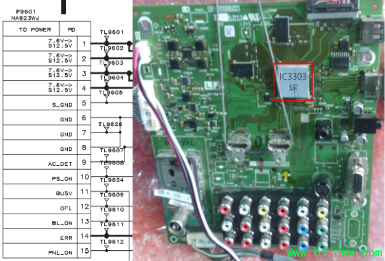 现象描述 :通电指示灯不亮,按电源键也没反应。 原因分析 :初步判断电源板或者主板问题。 检修过程 :通电测量电源板到主板P9601的插座 1 至 4 脚7.6V处于待机状态,按电源键开机也没反应(测量按键阻值正常),测量 P9601 的插座 10 脚 PS_ON 主板没有开机驱动电压到电 源板,由此判断为主板故障。 测量 DC-DC电路 IC9606的3.3V无输出,手摸 IC9606很发烫 测阻值为0欧,很明显负载电路有短路。经一路查到IC3303,确认该BGA已经短路。 解决方法 :更换IC3303后通电 主板工作正常 |
