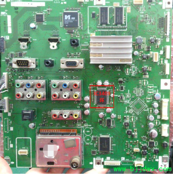 夏普LCD-52GE5A液晶彩电通电试机HDMI状态图像声音都正常,AV状态无图无声。 原因分析:排除外接信号源问题后判断是主板问题。 检修过程:该AV电路从信号输入端到中频信号处理IC3409,外围零件很少。测量IC3409第2脚供电端只有4V多正常是9V,手摸此IC比较发烫,断开电路测量IC3409第2脚对地阻值明显小很多,由此判断IC3409已坏。 解决方法:更换IC3409后通电AV和TV工作正常。 |