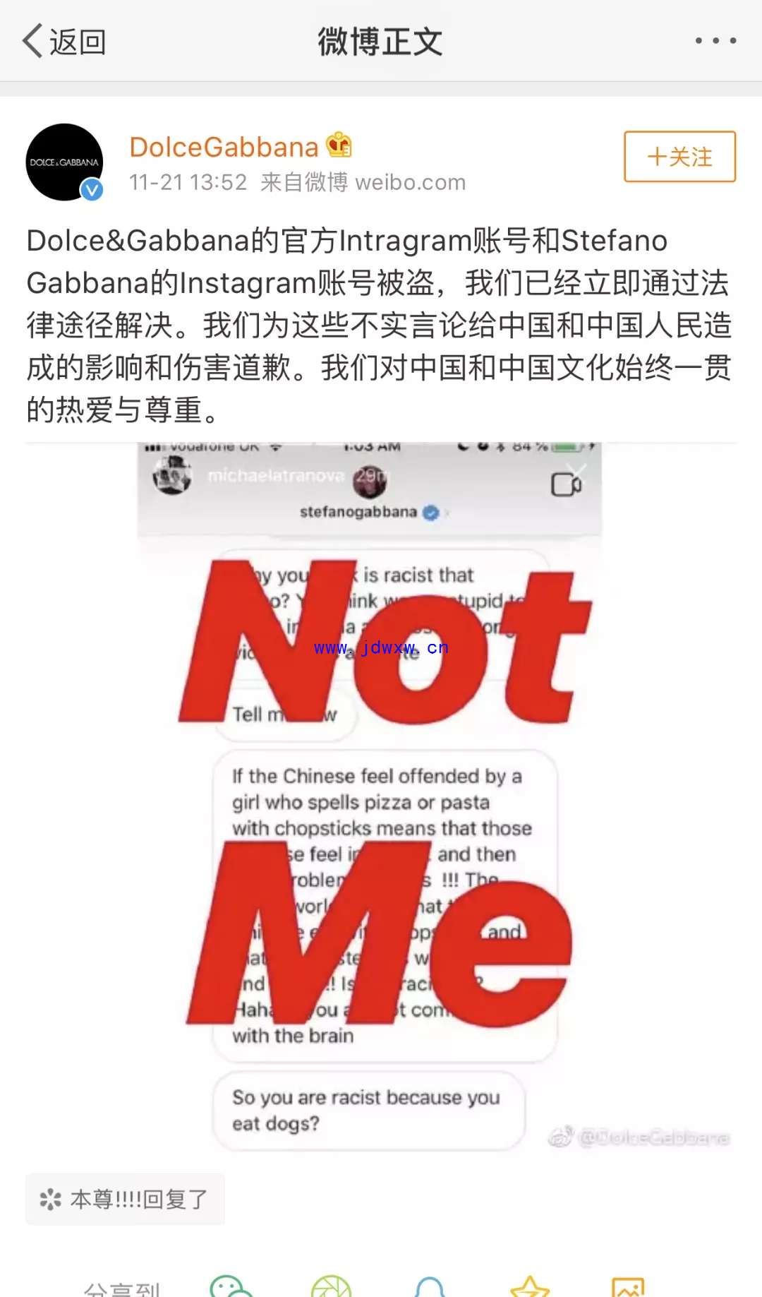 事情是这样的—— 一个叫D&G(Dolce&Gabbana)的牌子,杜嘉班纳,那个走起秀来装逼到不行的意大利土豪品牌就是了。 他们计划在21号在上海开个秀,于是提前在社交网络上发了三条主题为「起筷吃饭」自以为又能装逼成功的预热广告视频。 装就装吧,但却翻车了。 视频如下—— 01 02 03 连我看了都不舒服。。。 这特么很明显就是在歧视中国传统文化,以及不尊重女性啊! 可想而知。 网络必须是一边倒式的抗议到抵制,从明星到民众。 这时,他们家的终于公关出来了。 连吃瓜群众都了然于心,按流程就应该是先道歉,再删帖。 可dg他们家神鸟,居然发了这么一条微博。。。 大概意思是—— 这不关我们事啦,是账号被盗了,不仅官网ins被盗,很巧,连设计师ins也被盗了。 纳尼! 这锅甩给黑客??? 真特么当我们傻子啊。 虽说我是第一次知道这个牌子,还一度以为一直用来洗头的那个P&G,但居然来让理工男背锅,不能忍! 下面好心帮你们理一下sb的逻辑吧。。。 首先—— 错别字 你们微博官网的声明文中,第一个instagram拼错了。是不是觉得甩锅太用力把手指扭到了? 逻辑 你们微博声明中说,既然官方instagram账号被盗,我这有两个疑问—— 1请问是什么时候被盗的? 假如是刚刚被叼后才发现,那问题就来了,很明显你们是知道这件事,那还不是你们自己装逼翻车的后果?还演苦肉计贼喊捉贼。