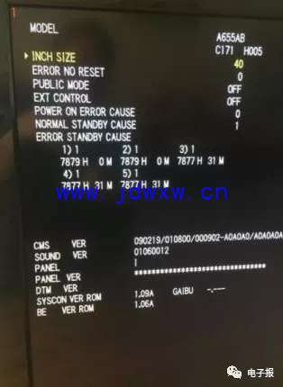 备注:直译下栏目,依次为:英制尺寸、故障没复位、普通模式、安全控制、电源故障原因、正常待机原因、故障待机原因。移动光标,只有两页,有些菜单不能进入修改。