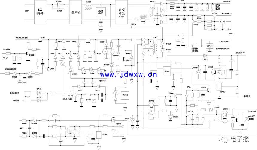 顺着逆变的主回路中,可以找到一个互感器T7600,为逆变电流取样元件。用分流的办法试试,如图4所示,并接电容为102P。开机观察没有跳电,过了两小时后,出现几次跳电,虽然没有根除问题,但是出故障的时间有明显的变长。这说明现在的逆变工作电流增大了,管子本身性能下降,造成波形不好,或者逆变的负载太重。查了一下逆变管K3562的额定电流6A,虽然加了分流电容,减弱过流保护,也不担心会损坏,暂时保留着该电容。 二、深度分析 以上种种办法都收效甚微,黔驴技穷,该机也找不到图纸,印板上的保护电路又较为复杂,决定对电路深入分析测绘一下电路图。花了几天时间,边查找边理解边修改,从草图到CAD画图(见图5),终于知道电源板的大体结构了。简化的局部电路图中未标电阻和电容的编号,只标了三极管和二极管的编号。虽然多遍浏览电路图,再反复对照印板元件修改,难免会有错误,所以此图仅供参考。