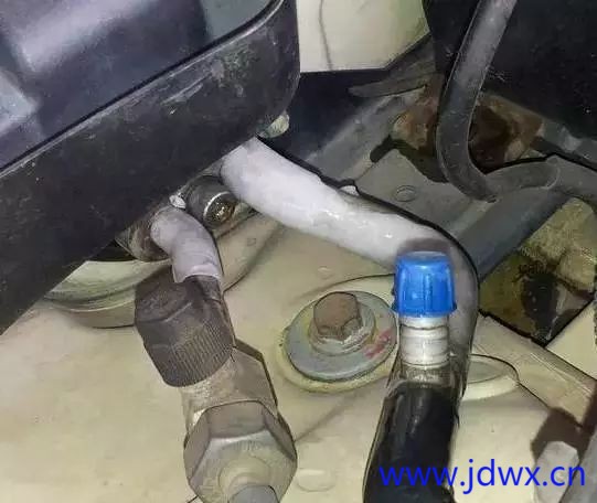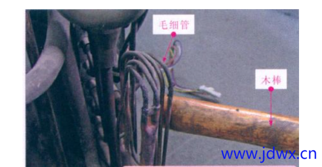 检修中,技术人员先用工业电吹风加热毛细管至常温,内部冰堵开始融化,但吹出的冰屑中夹杂较多黑色碎屑。化验表明,黑色碎屑主要是含碳颗粒,应是压缩机润滑油的裂解产物。据此,判断该空调系统油污严重,需要对毛细管进行彻底清洗。