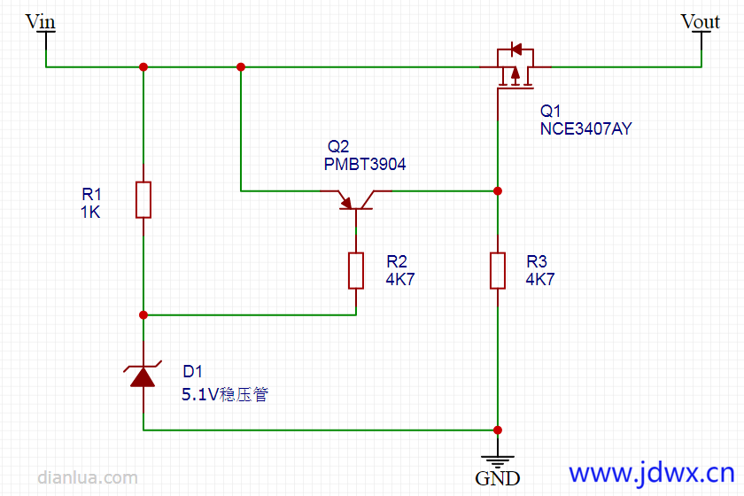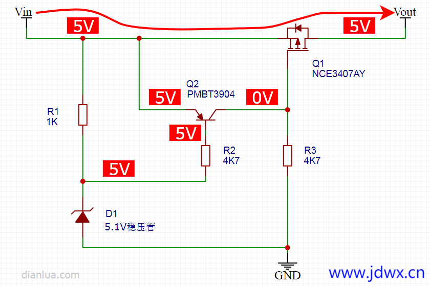5V过压保护电路分析:稳压管、三极管、MOS管: