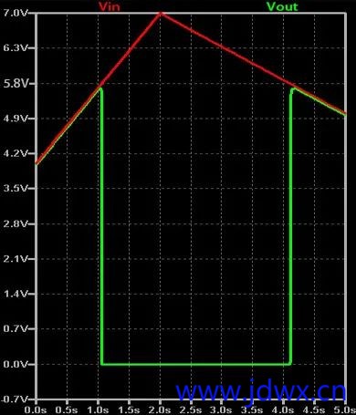 此时MOS管Q1的 Vgs = 0,所以MOS管Q1不导通,即此时“5V过压保护电路”认为输入电压Vin已经过高,将输出电压Vout关断,从而保护了后面的负载电路。输入电压Vin与输出电压Vout的关系大致如下: