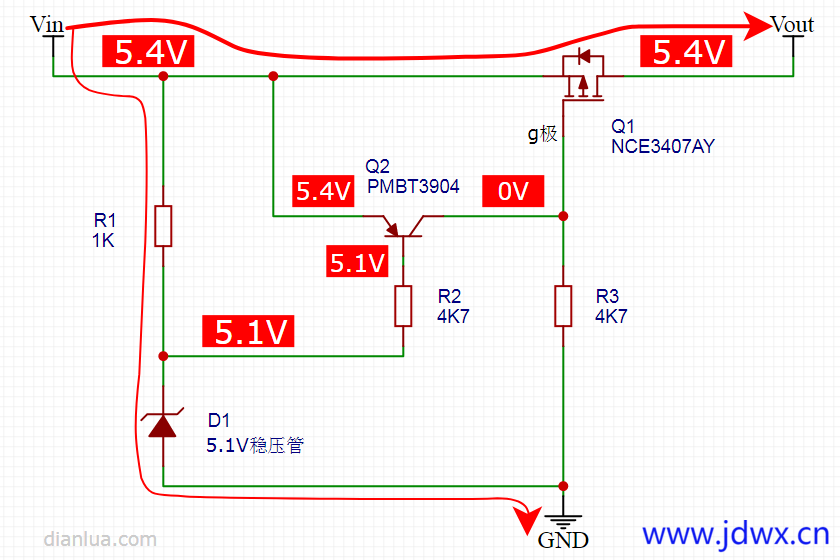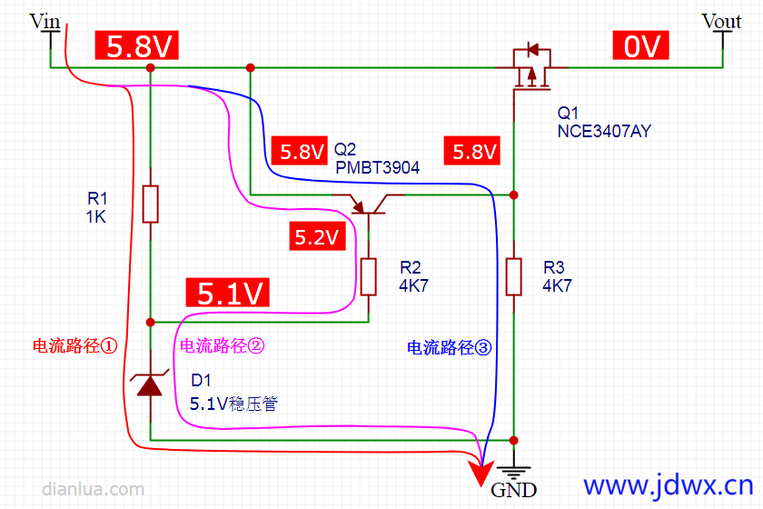 此时输入电压Vin = 5.4V,大于稳压管D1的稳压值5.1V,所以稳压管导通并稳压在5.1V。此时三极管Q2的 Vbe = 5.1V - 5.4V= -0.3V。PN结的导通电压要求Vbe达到-0.6V,所以三极管Q2仍然不导通。MOS管Q1的g极被电阻R3拉到0V。MOS管Q1的 Vgs = -5.4V, 所以MOS管Q1导通, Vout电压等于5.4V,对后级电路正常供电。3、当输入电压 Vin > 5.7V时:(下图以输入电压 Vin = 5.8V 举例)