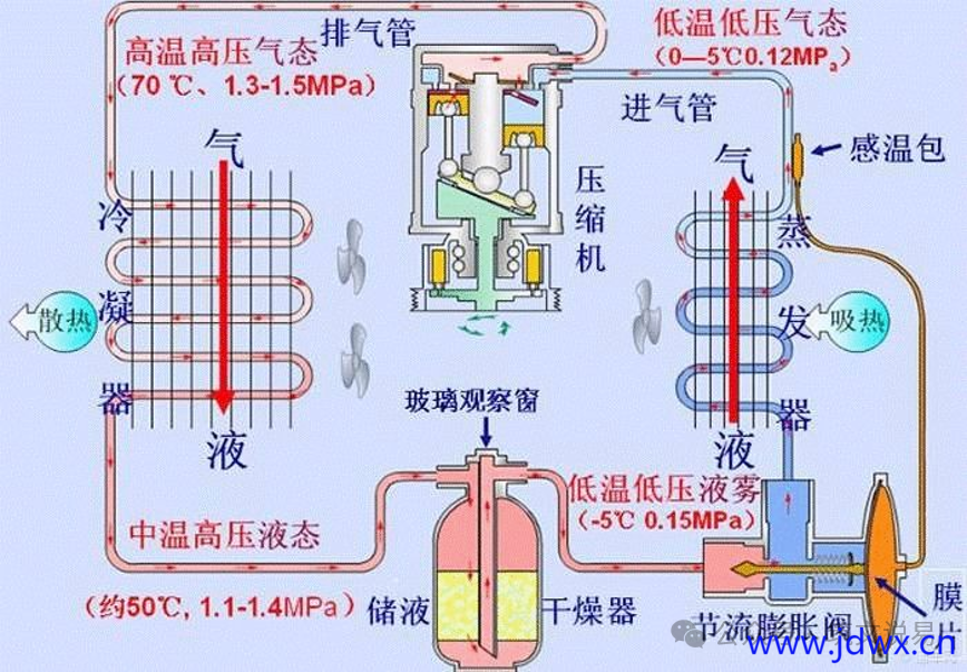 实际上,整个制冷系统中可以近似地认为只有两个压力,即高压压力和低压压力。高压压力即冷凝压力,低压压力即蒸发压力。