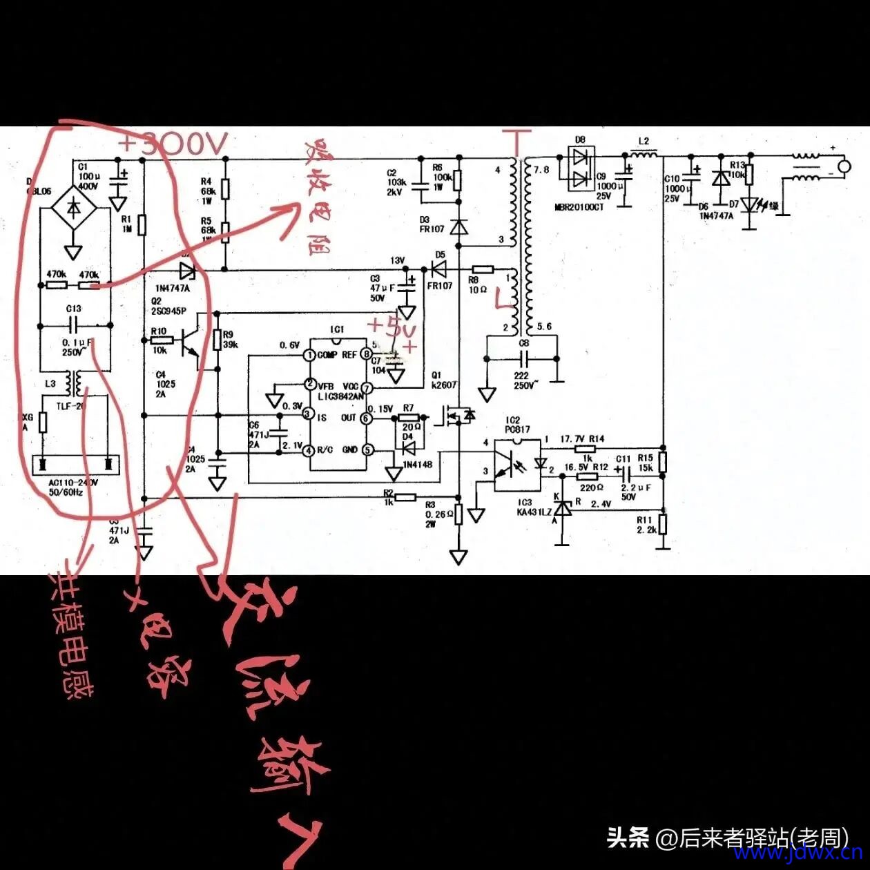 再经过两个470K电阻组成的吸收电路,吸收关机时x电容储存的能量,之后经整流桥D整流,C1滤波形成+300v电压。