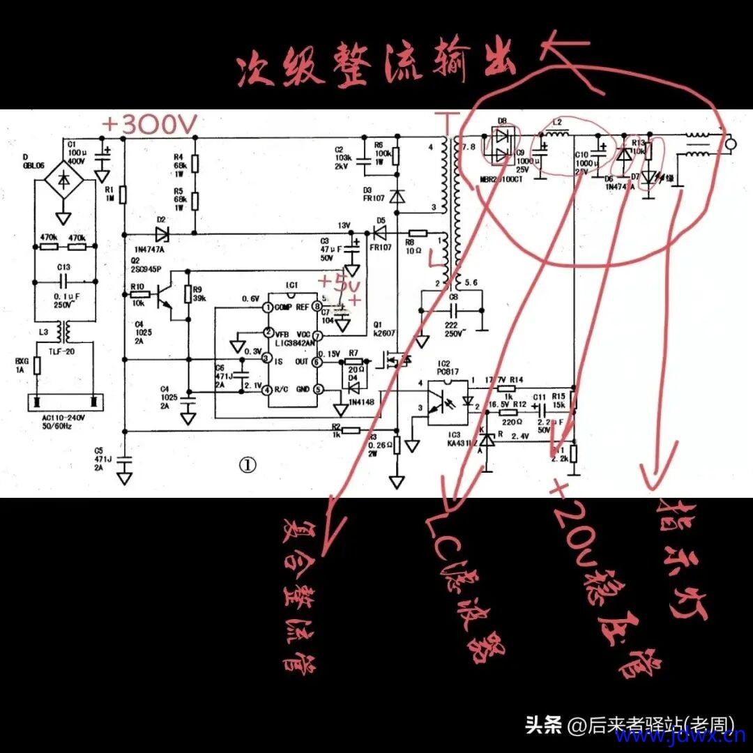 次级感应电势由复合二极管D8整流、电容C9、L2、C10滤波,20V稳压管D6稳压形成稳定的+20V直流电给电脑供电。