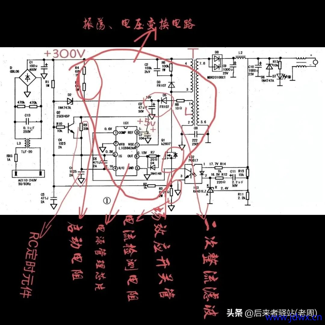 该电路由电源管理芯片UC3842、场效应开关管Q1及开关变压器T为主要元器件,及周围电路组成。