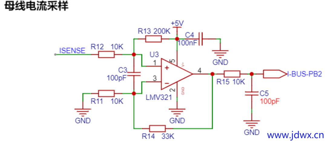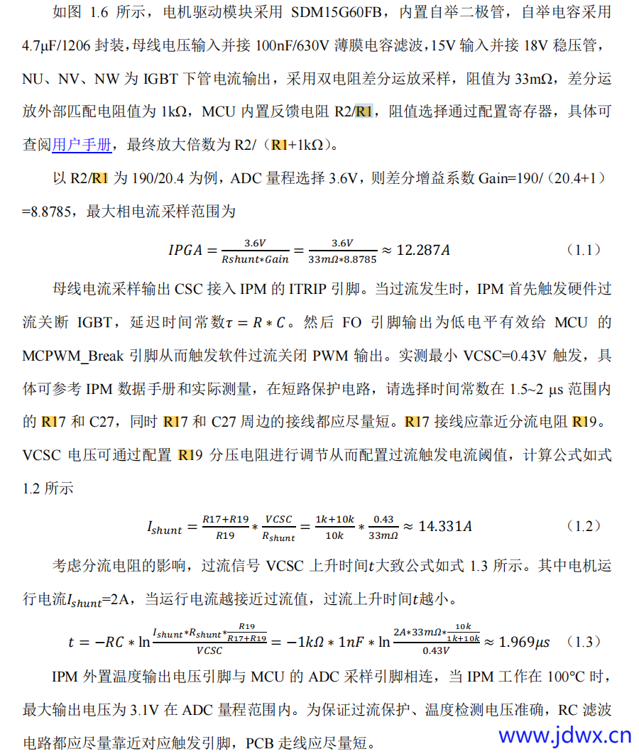 原理图部分:电机电流采用 U、V 相双电阻采样,母线电流采样电阻为 33mΩ,封装为 2512 功率为 1W,若应用大功率,电机相电流超过 5A 的情况下推荐使用 3W。